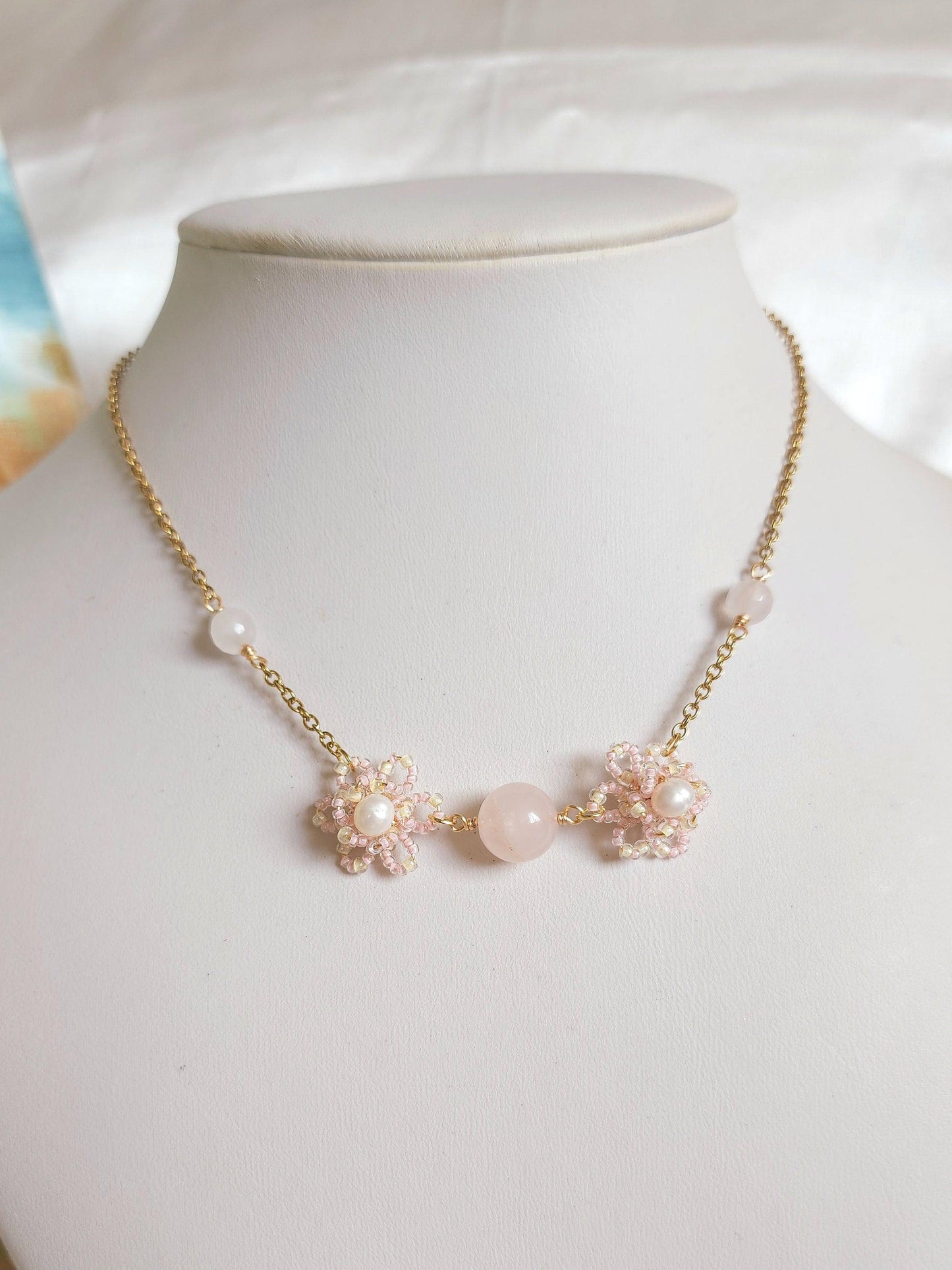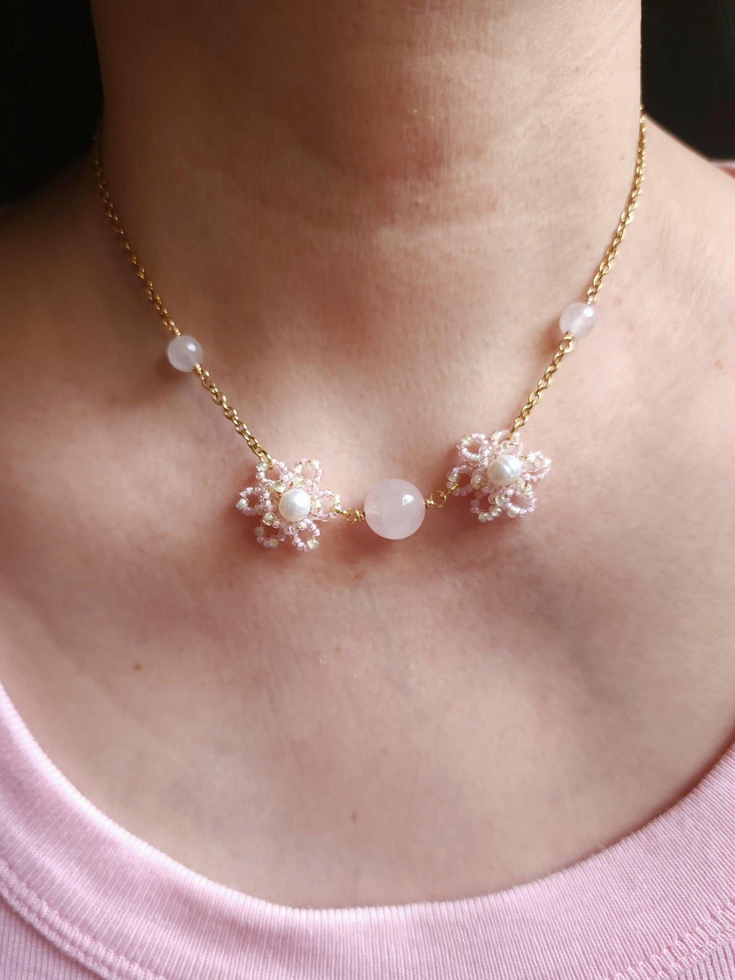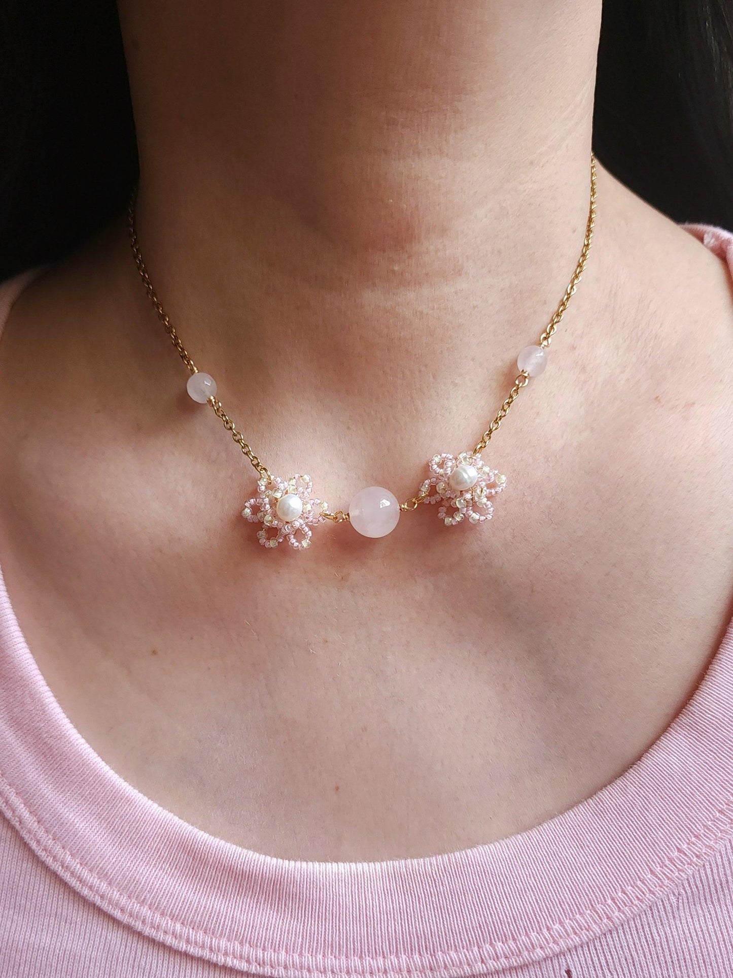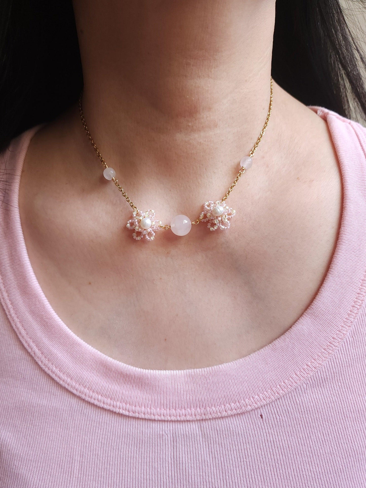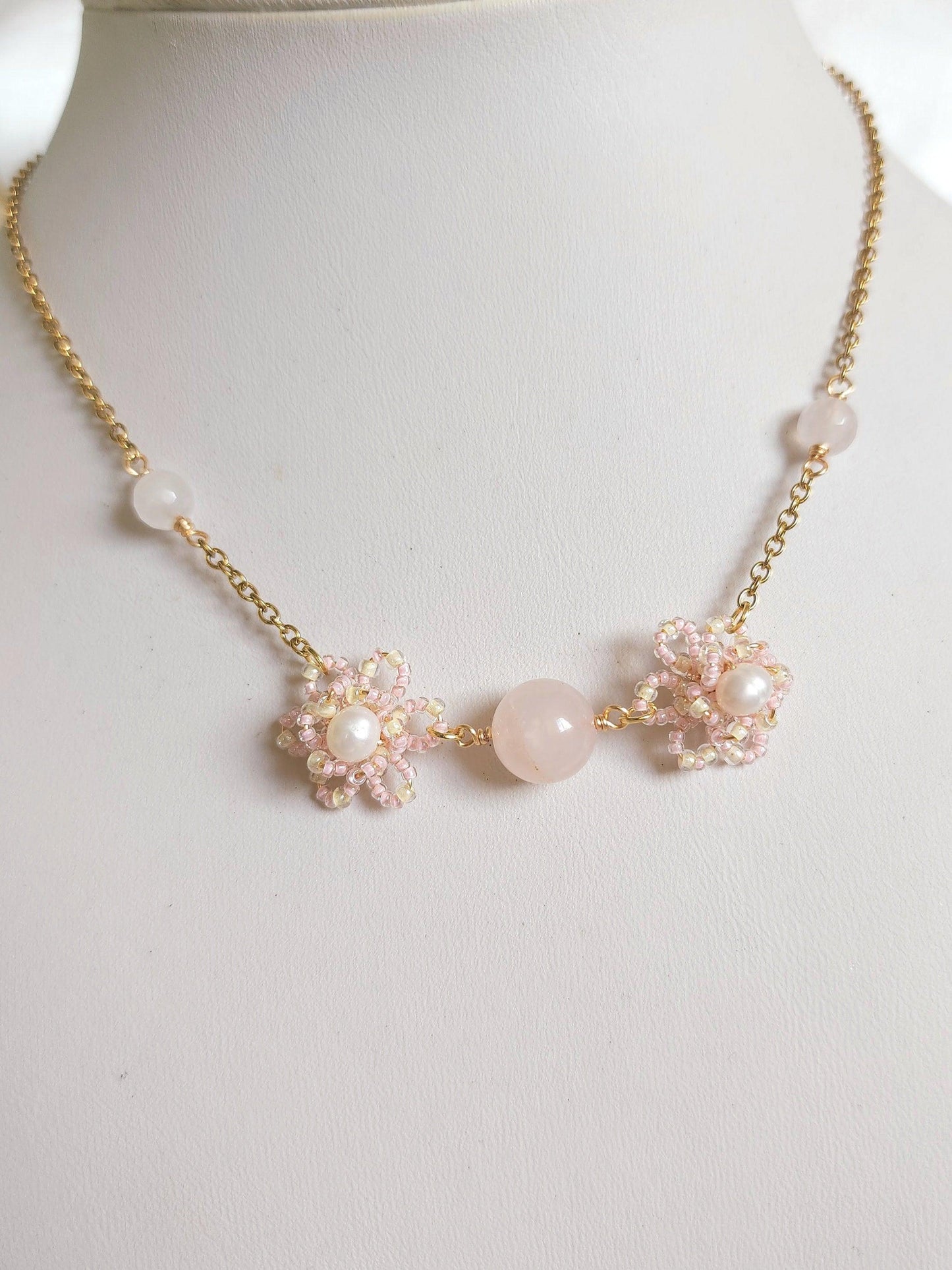 - Handcrafted with rose quartz, freshwater pearls, glass beads and gold-plated findings.