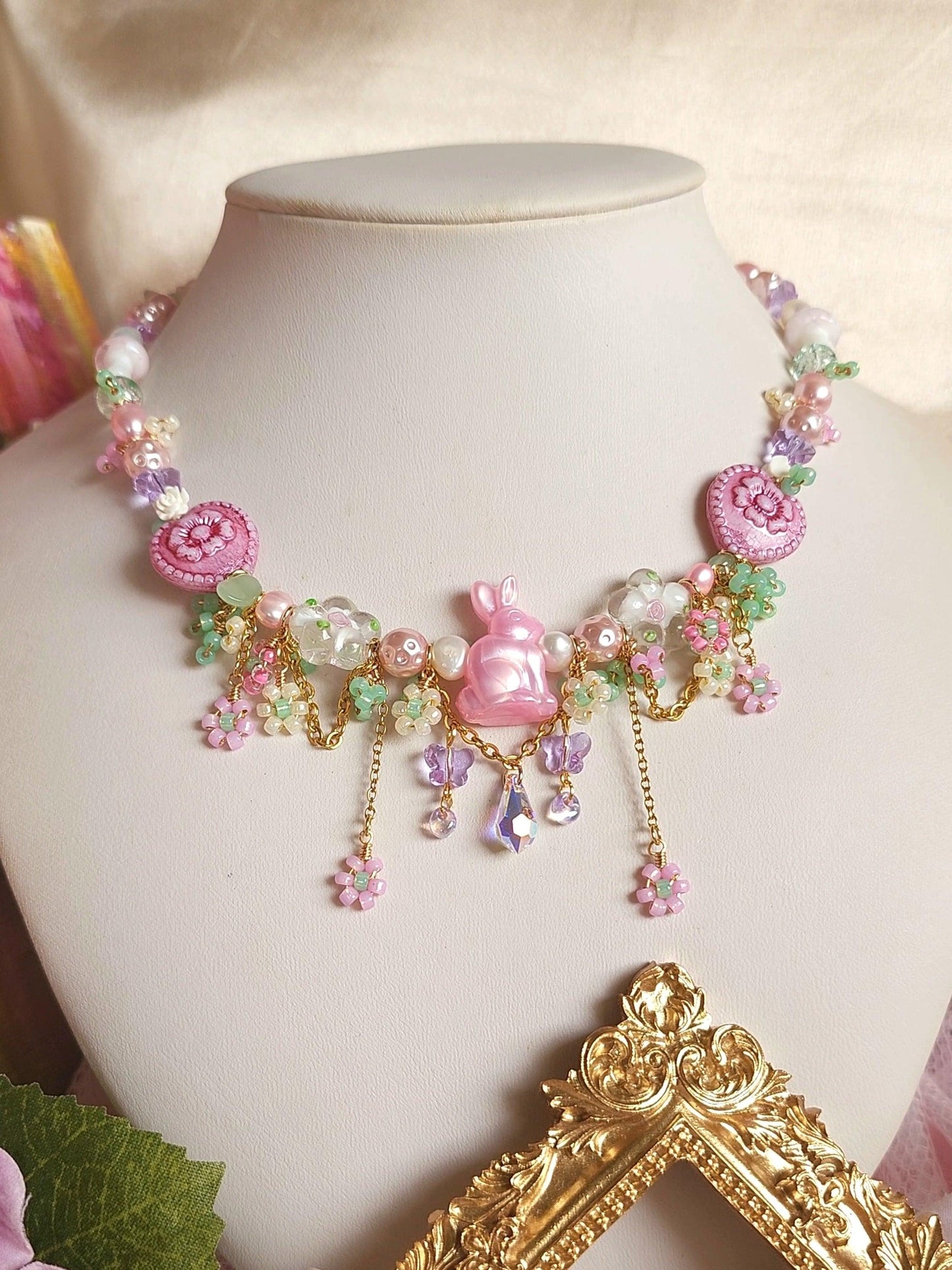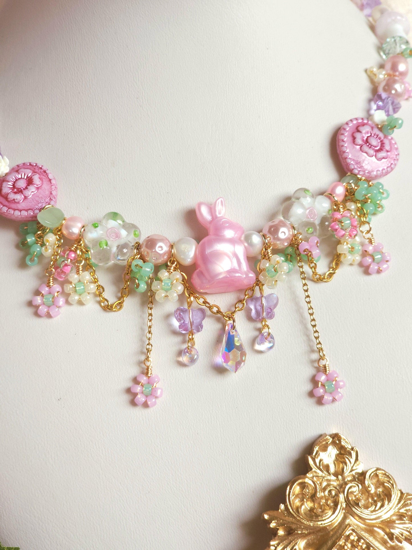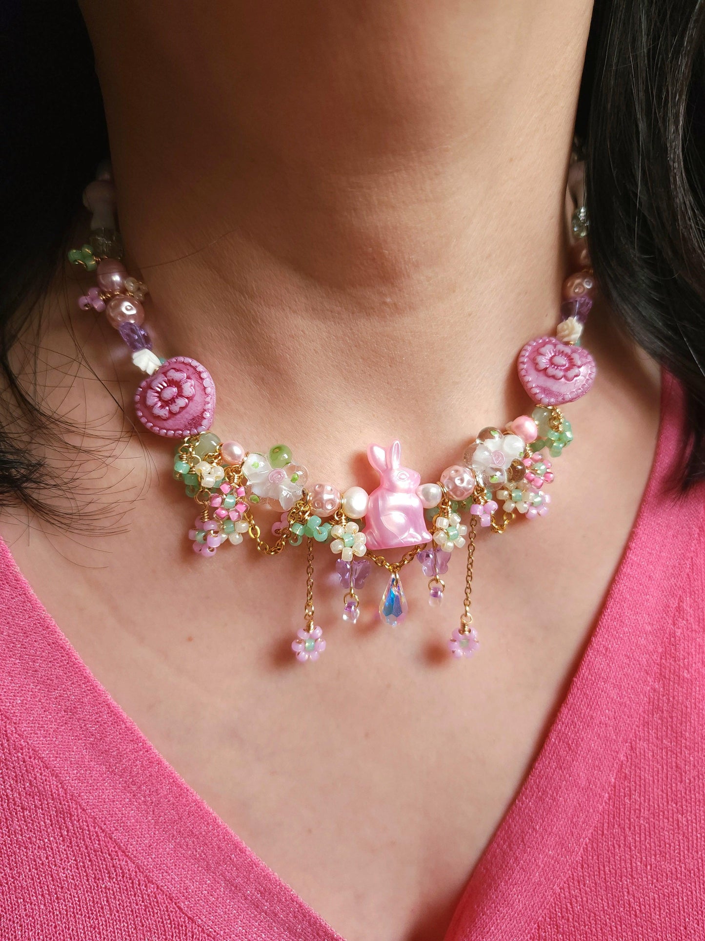 The Dream Bunny Necklace features an adorable pink bunny centerpiece nestled within a garden of pink and yellow beaded flowers, accented by green beads that resemble delicate bushes. Beneath the bunny, a sparkling crystal briolette dangles gracefully, framed by purple crystal butterflies, creating a whimsical, fairytale charm.