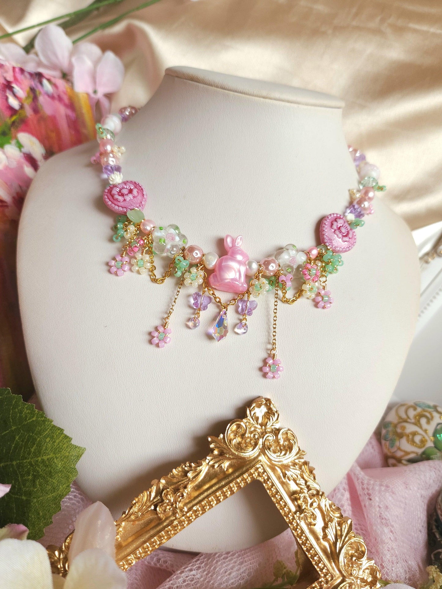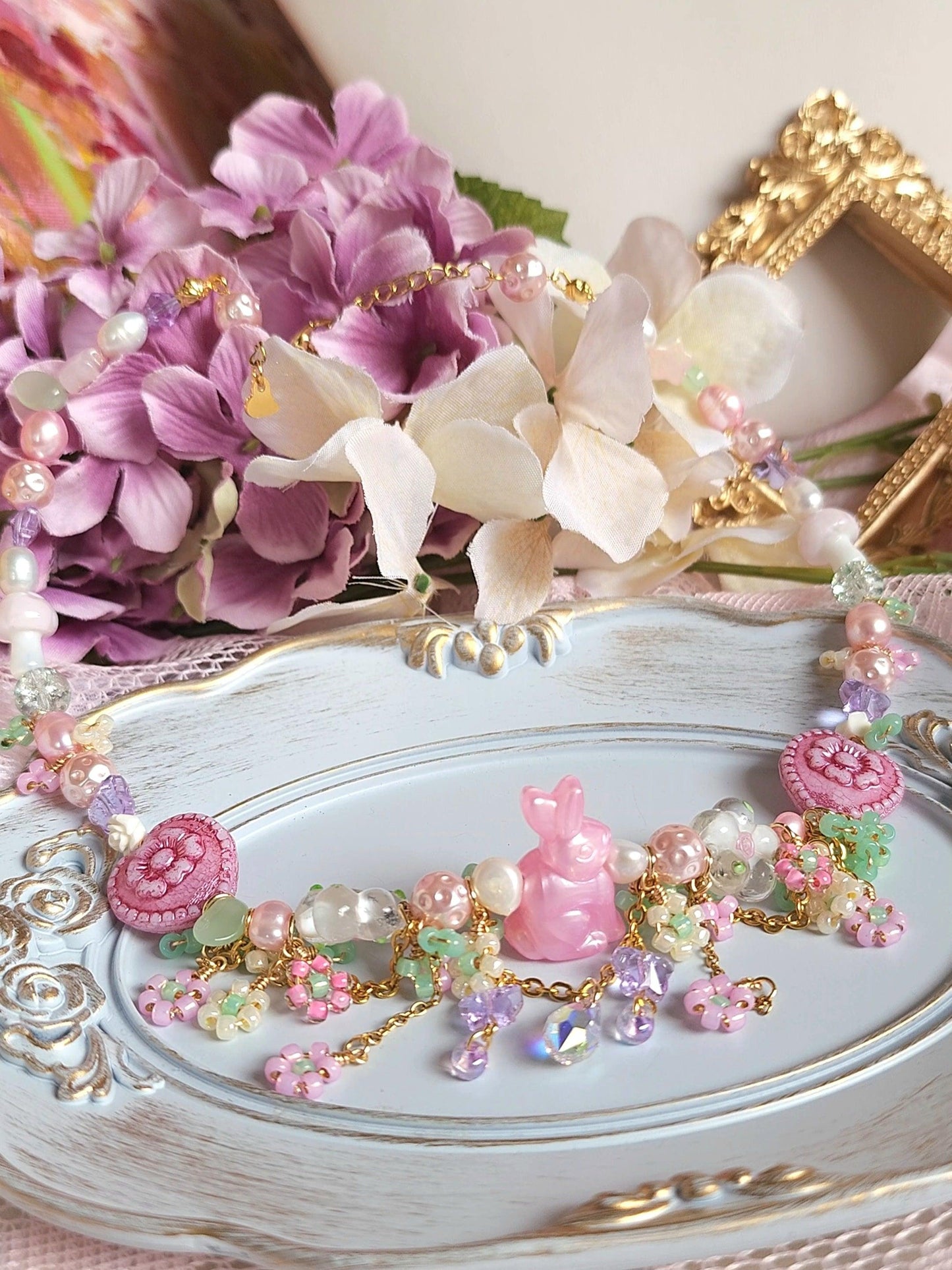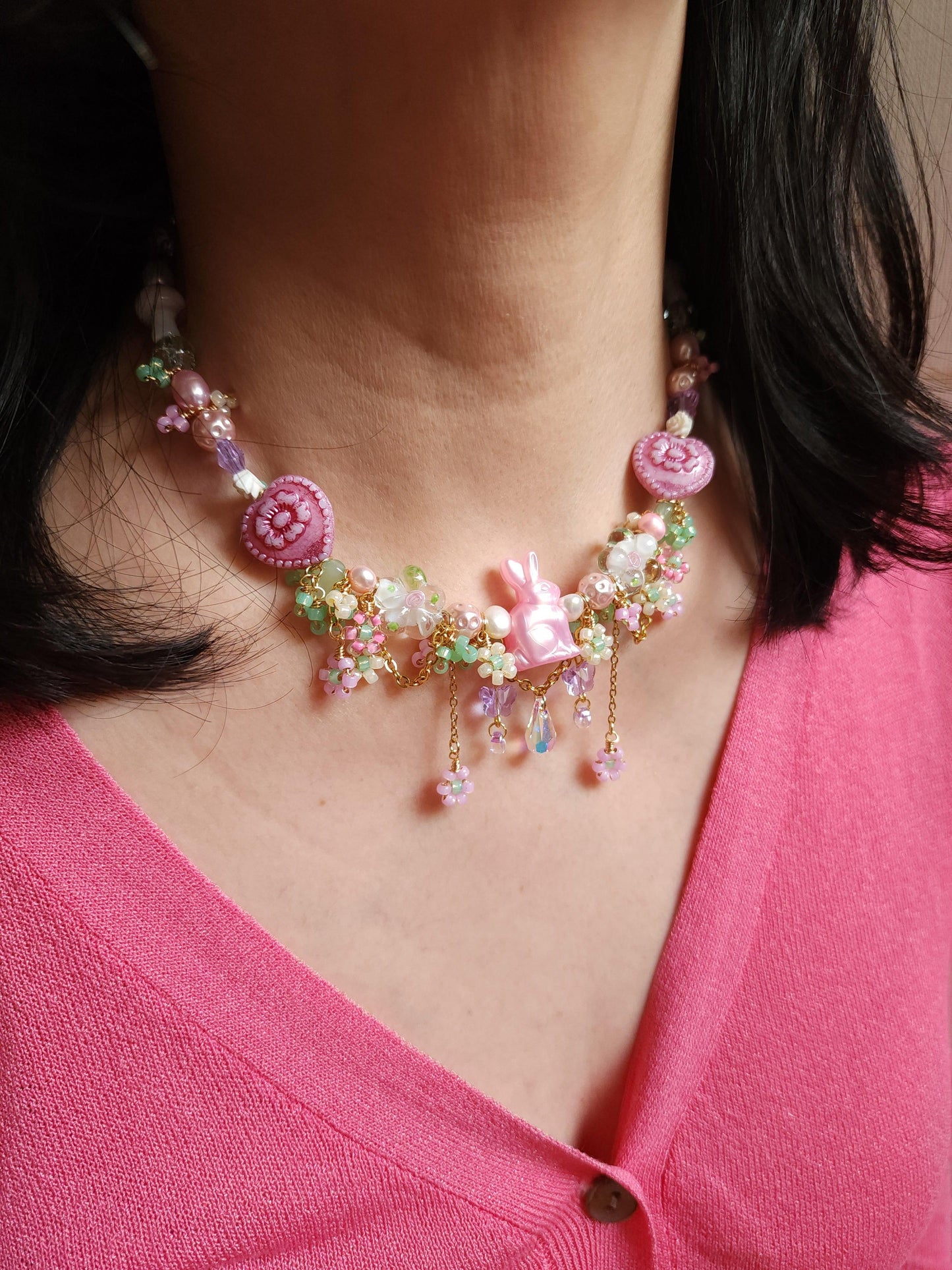 The Dream Bunny Necklace features an adorable pink bunny centerpiece nestled within a garden of pink and yellow beaded flowers, accented by green beads that resemble delicate bushes. Beneath the bunny, a sparkling crystal briolette dangles gracefully, framed by purple crystal butterflies, creating a whimsical, fairytale charm.