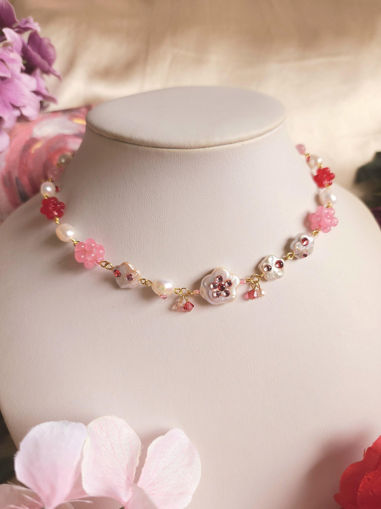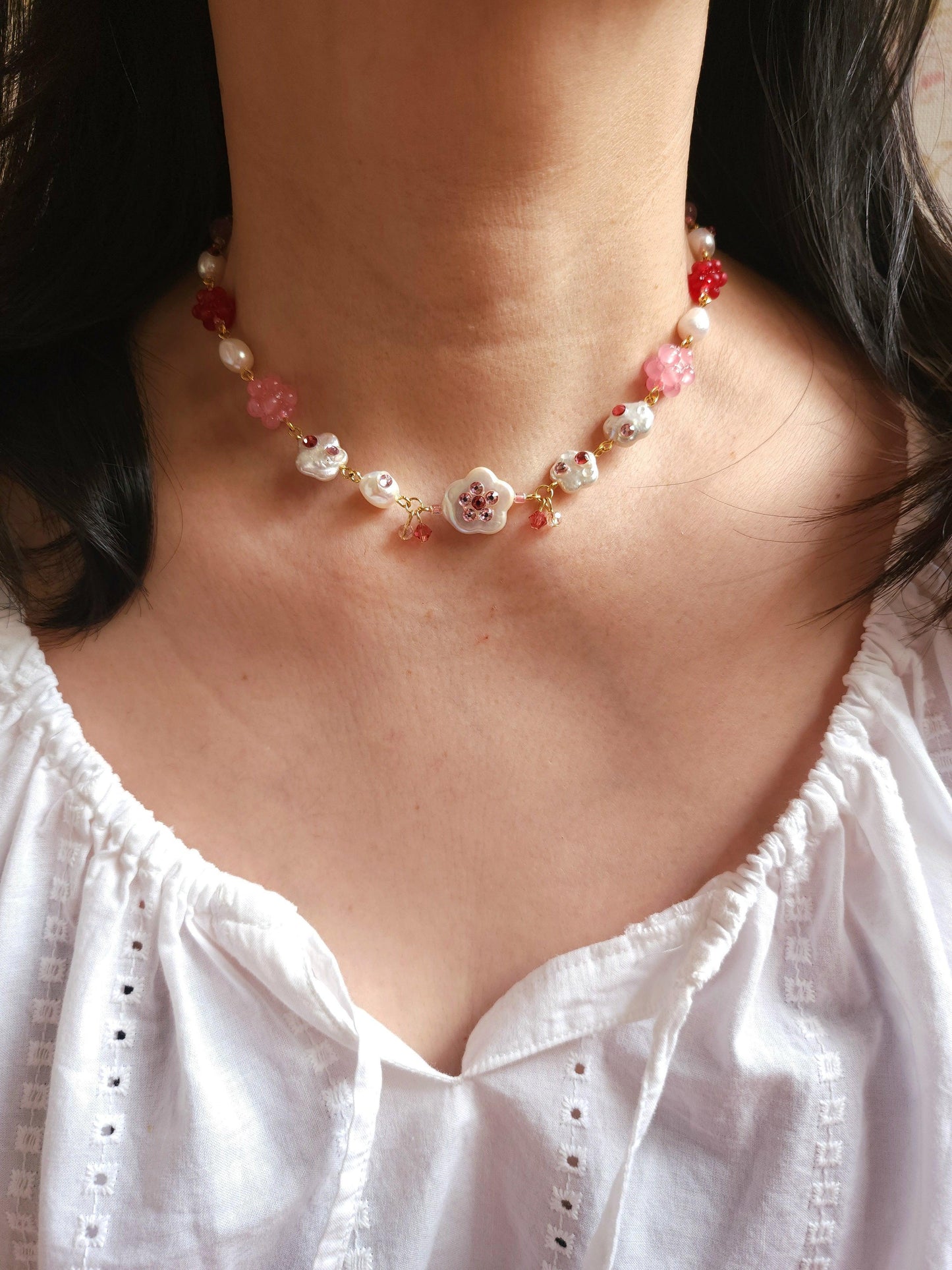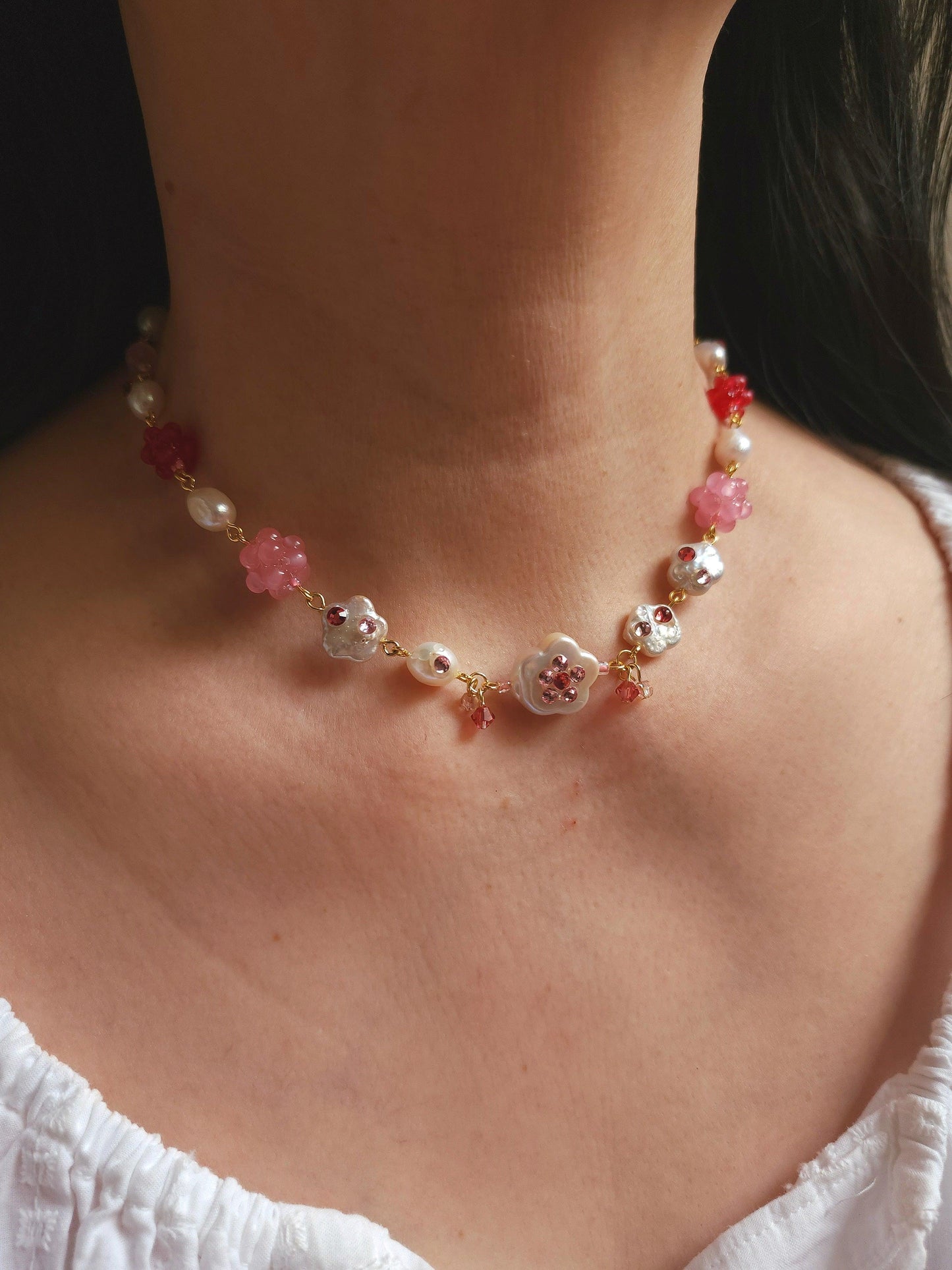 The Raspberry Reverie Necklace features flower-shaped pearls adorned with sparkling crystals, perfectly complementing the beaded red and pink "raspberries" that line the necklace. Vibrant yet refined, the addition of freshwater pearls elevates this playful piece with a touch of elegance.