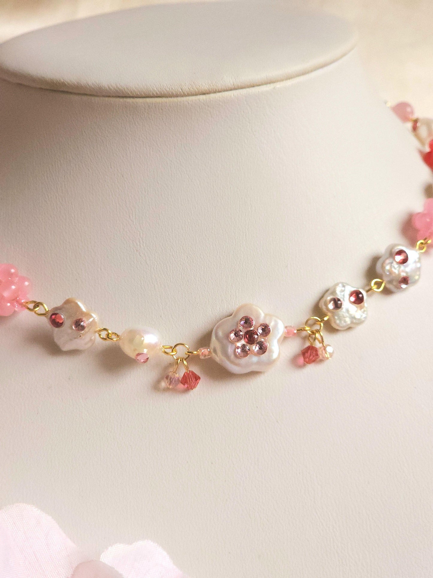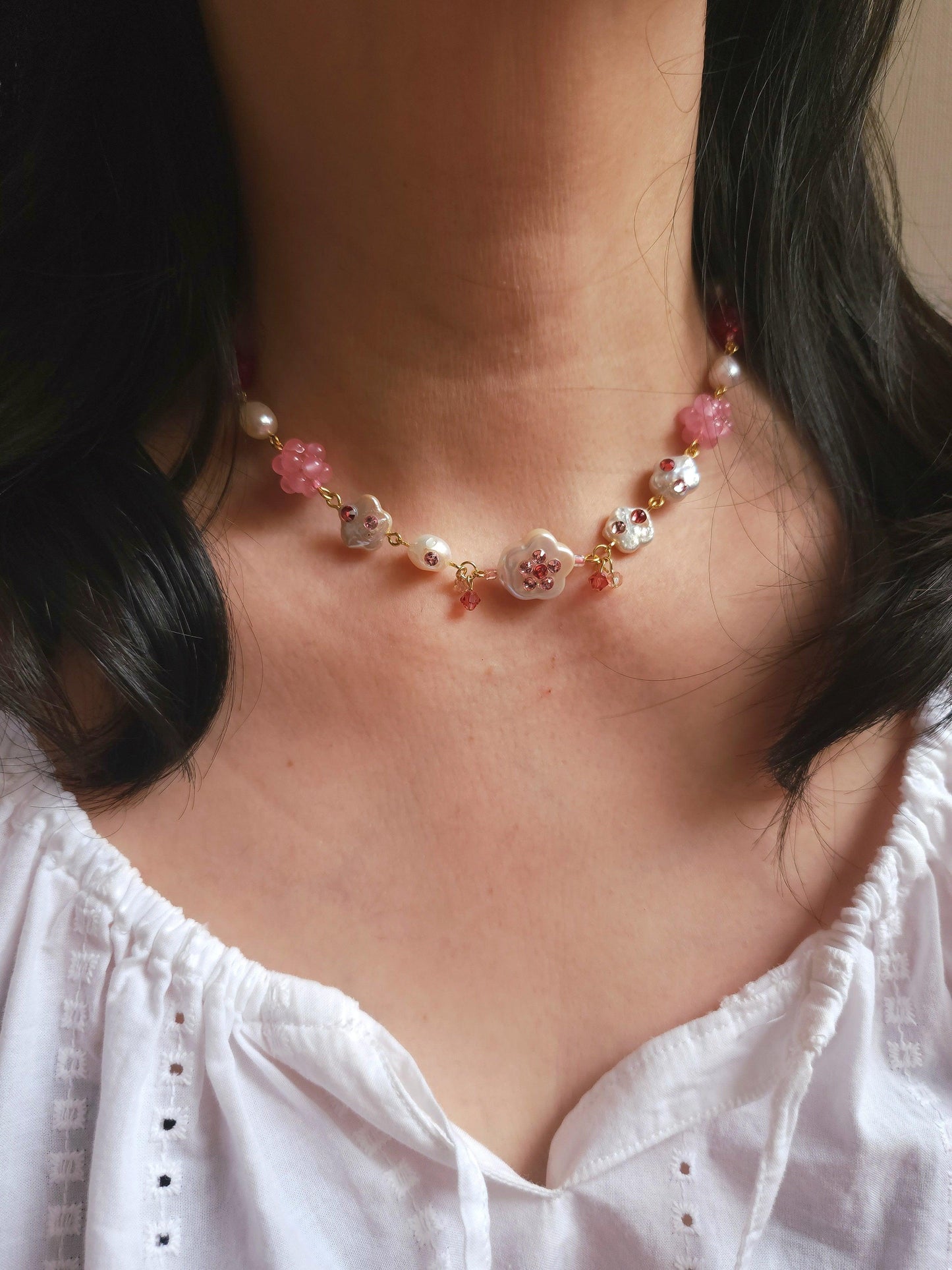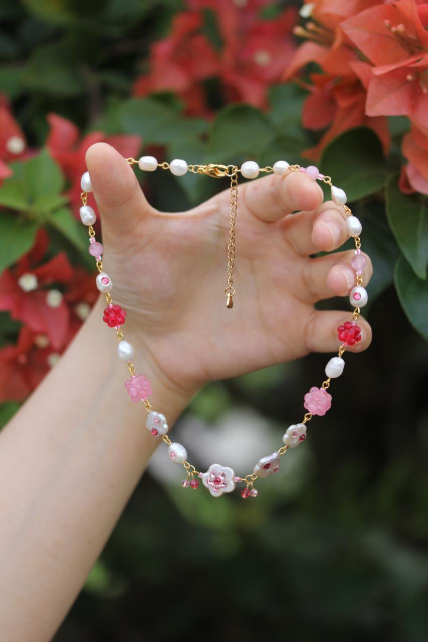 The Raspberry Reverie Necklace features flower-shaped pearls adorned with sparkling crystals, perfectly complementing the beaded red and pink "raspberries" that line the necklace. Vibrant yet refined, the addition of freshwater pearls elevates this playful piece with a touch of elegance.