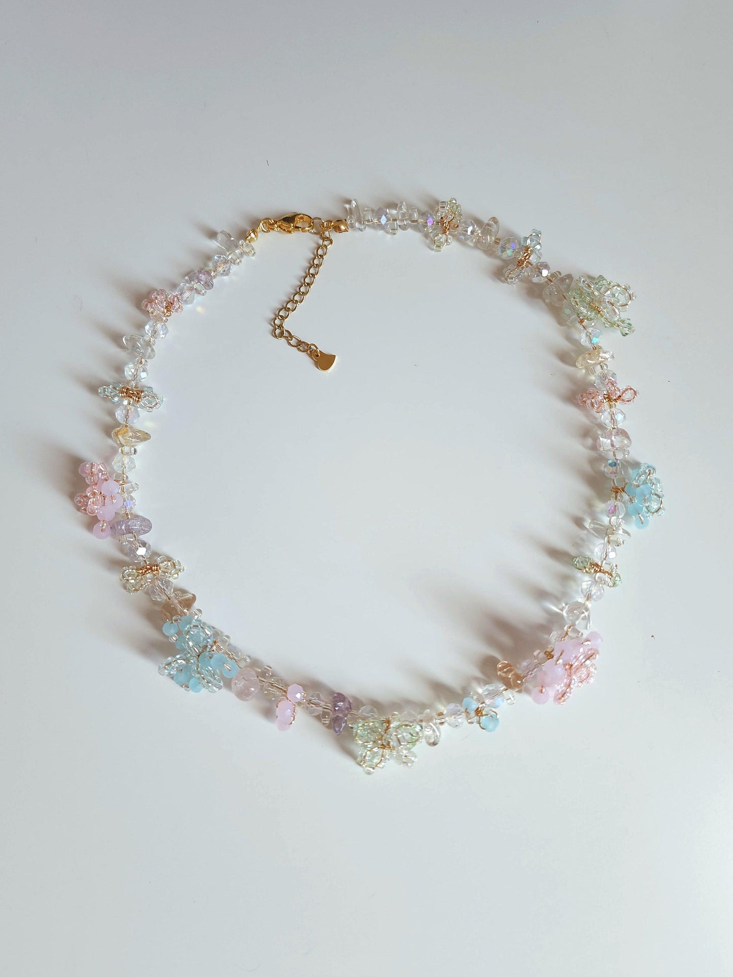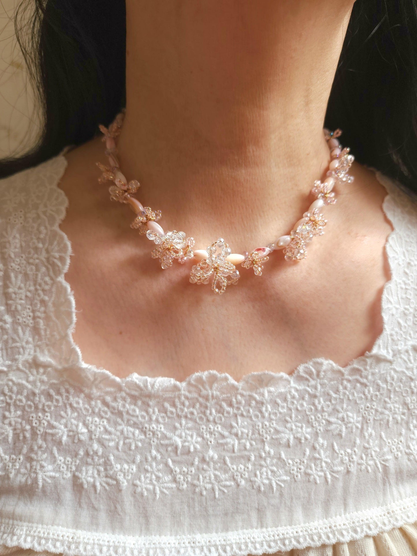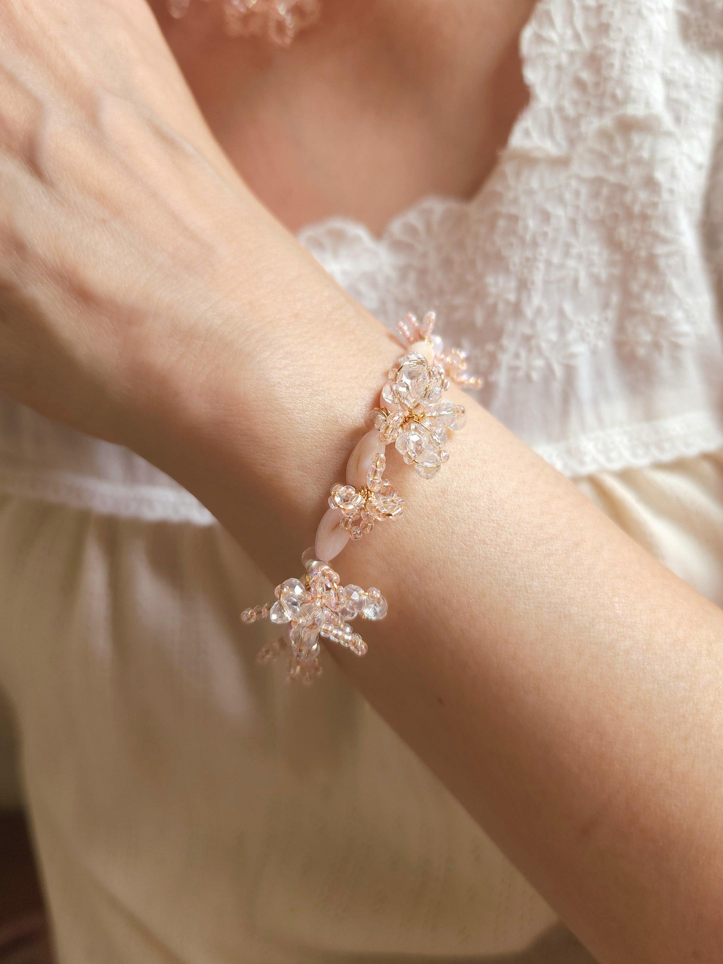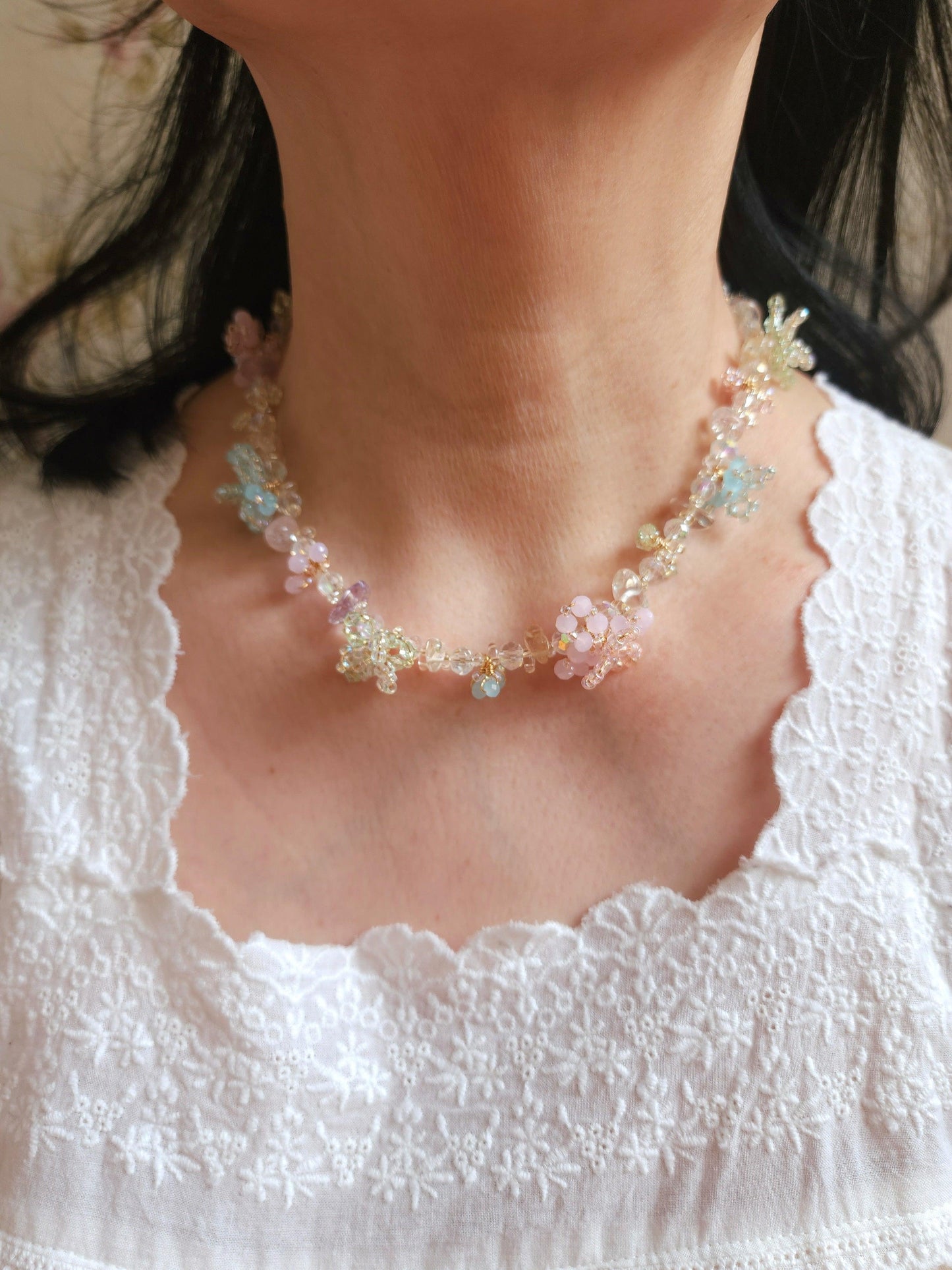 A collection of jewellery with experimental designs featuring intricate 3D blossoms in soft, dreamy hues, handwoven with delicate seed beads and faceted glass. Each piece is a unique expression of texture, color, and light.