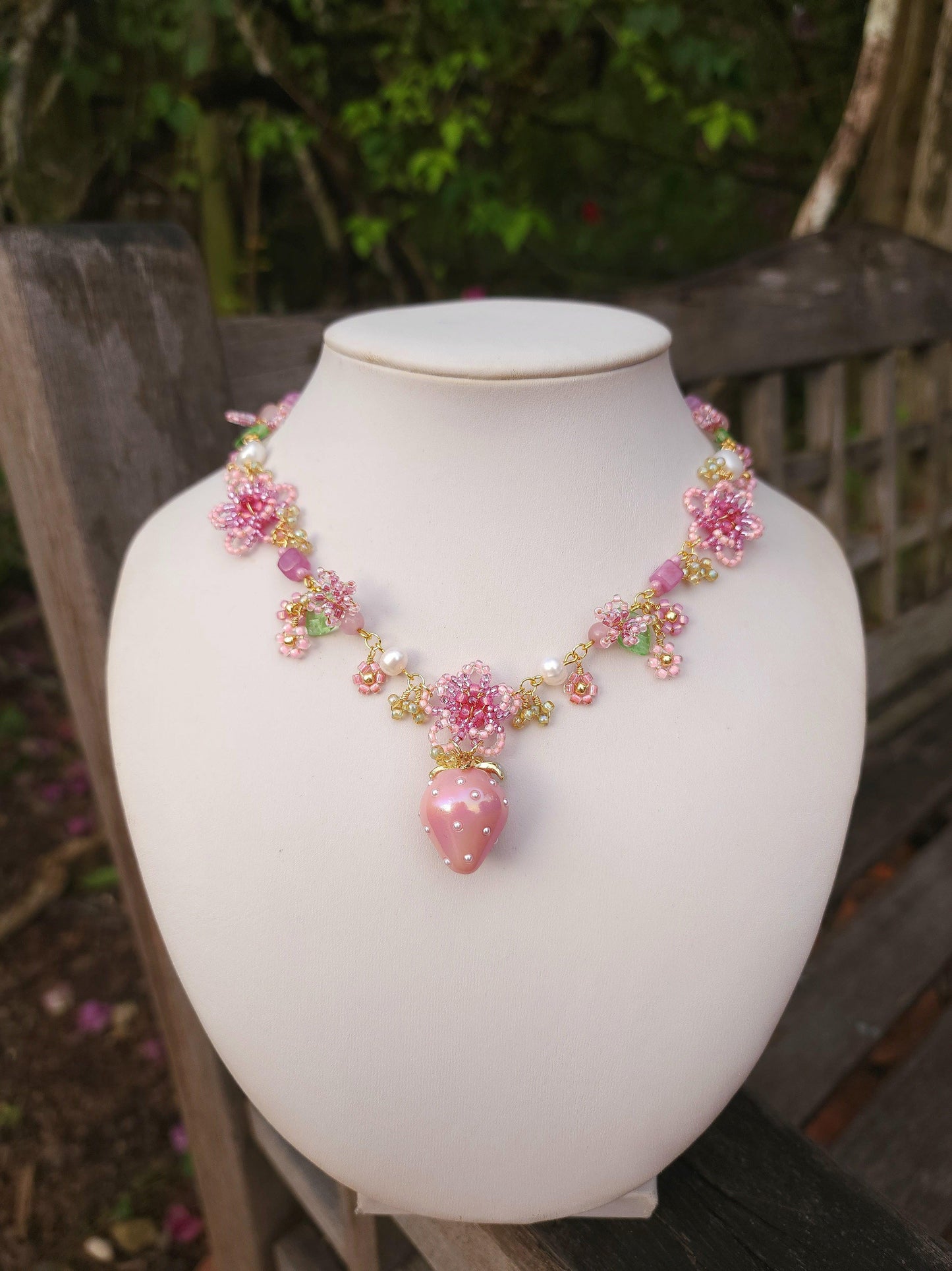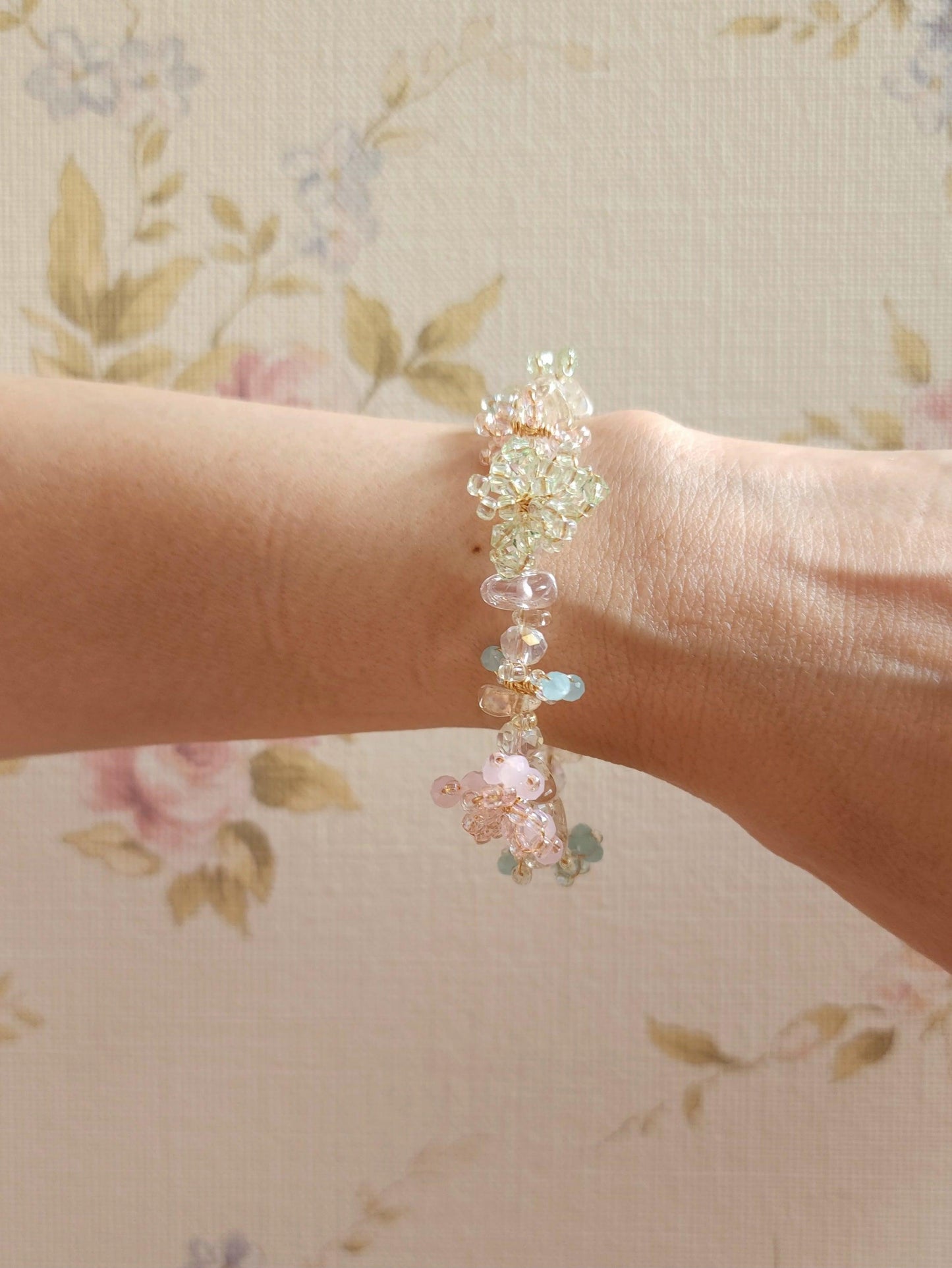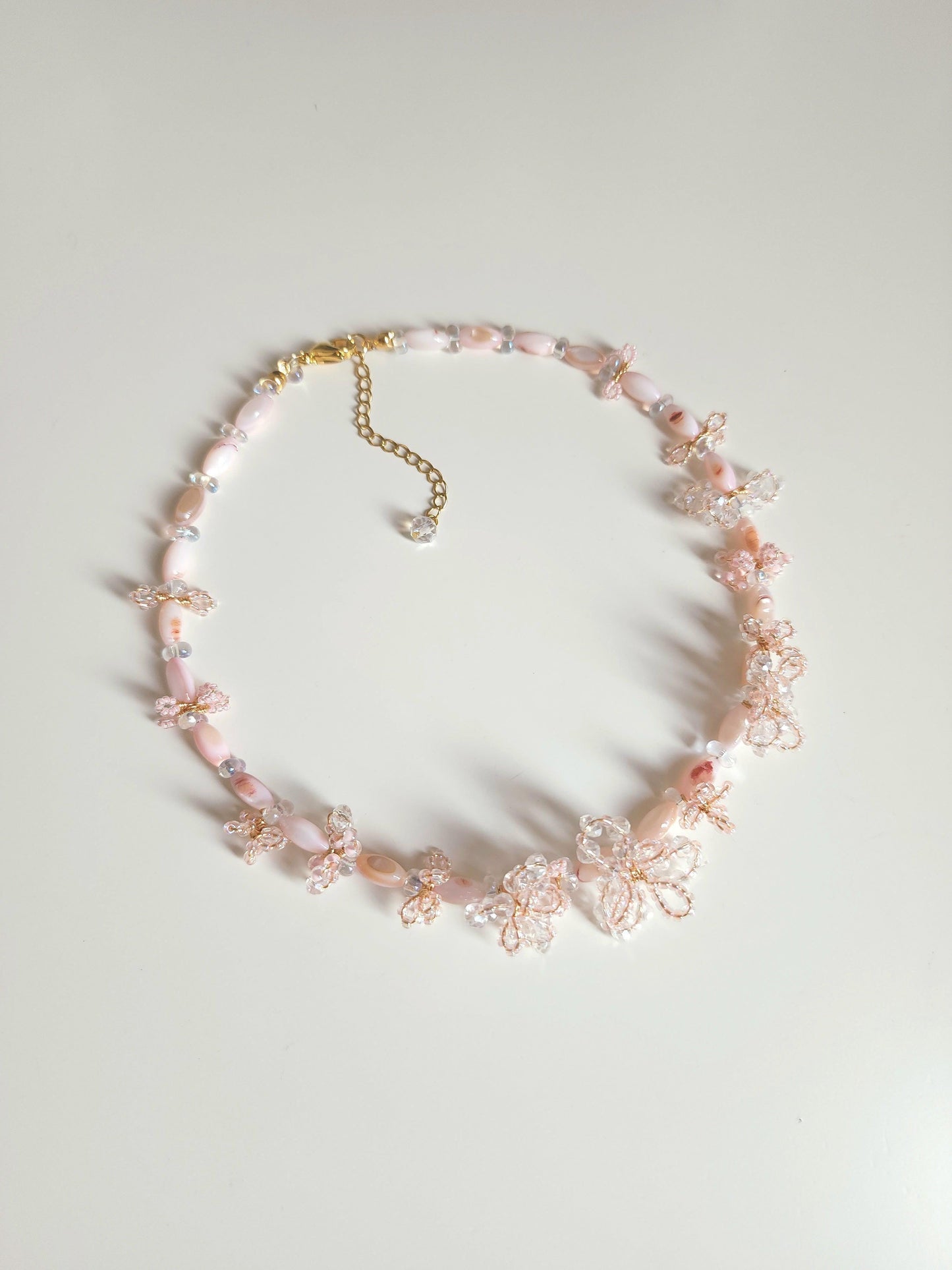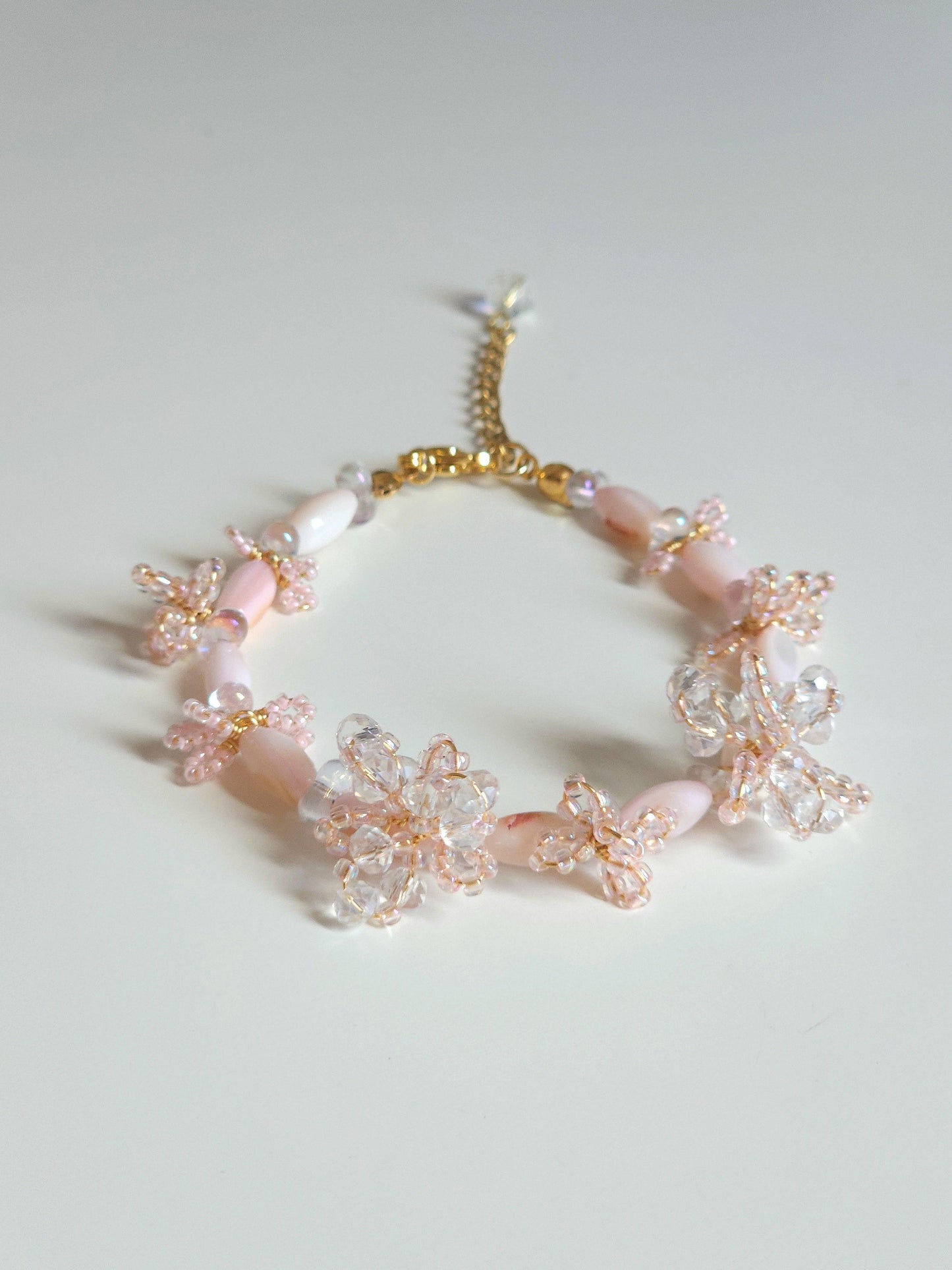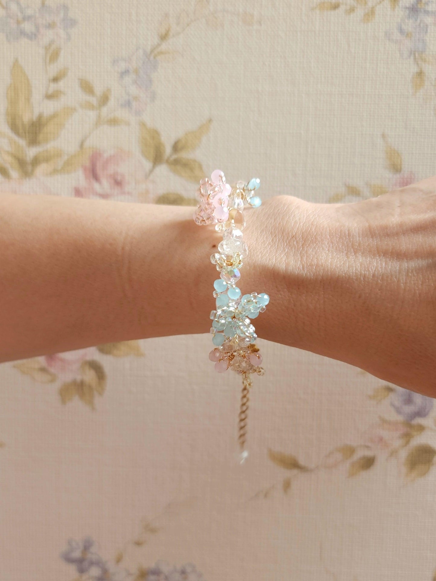 A collection of jewellery with experimental designs featuring intricate 3D blossoms in soft, dreamy hues, handwoven with delicate seed beads and faceted glass. Each piece is a unique expression of texture, color, and light.