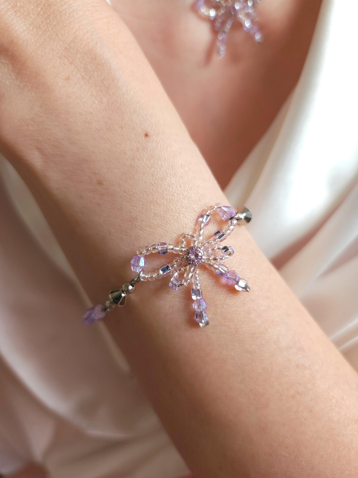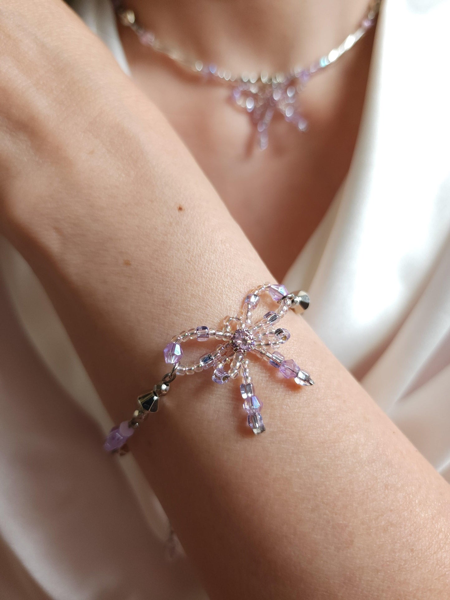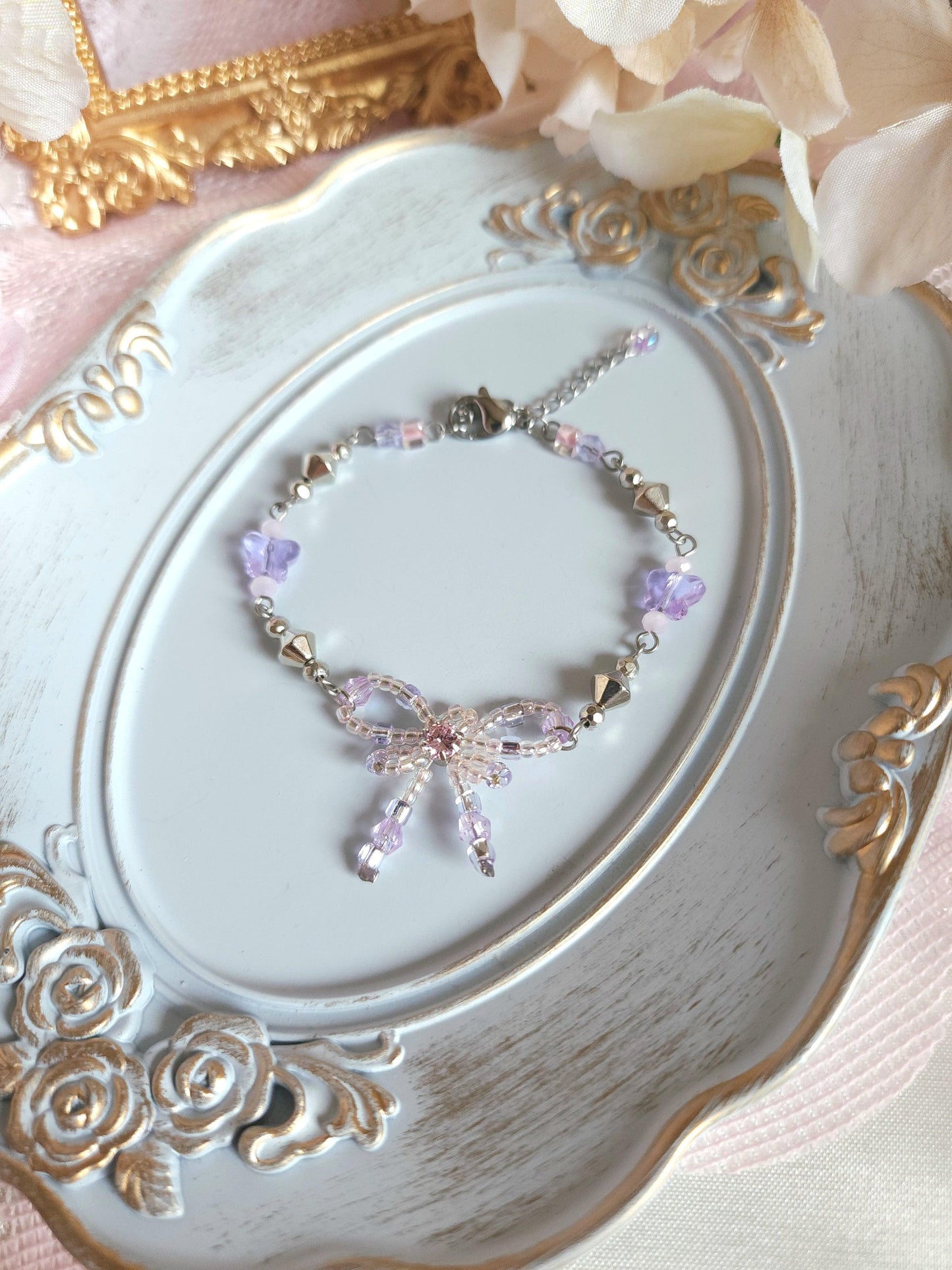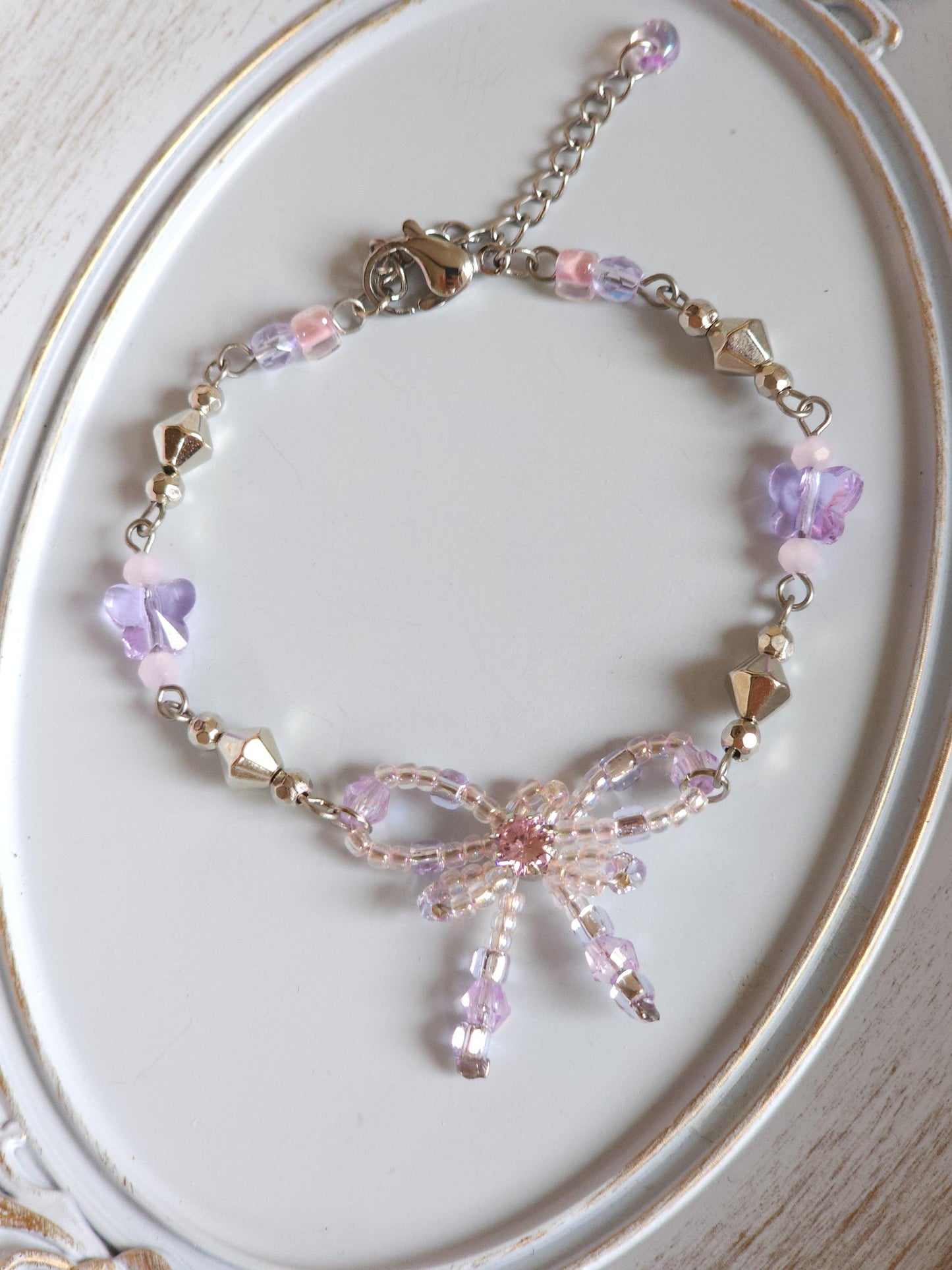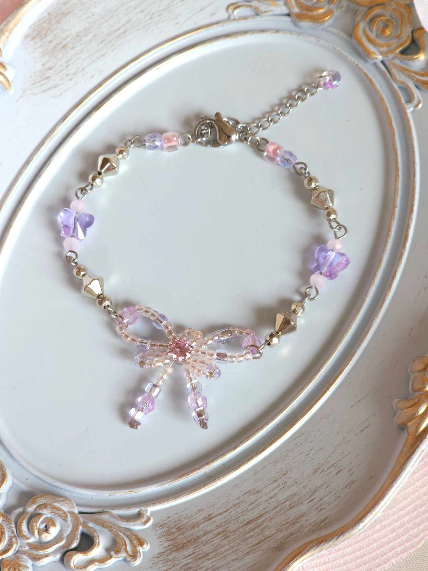 Add some subtle magical girl elements to your outfit with this bracelet featuring a mini Galaxy Glow Ribbon that is beaded with a sparkly pink core and iridescent pink and purple beads.