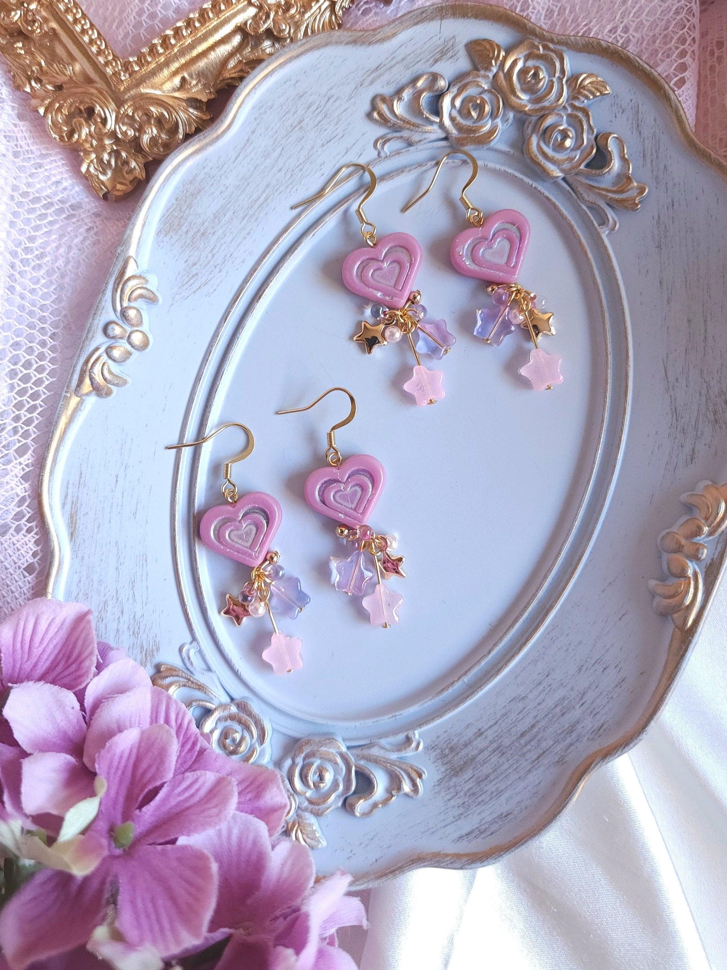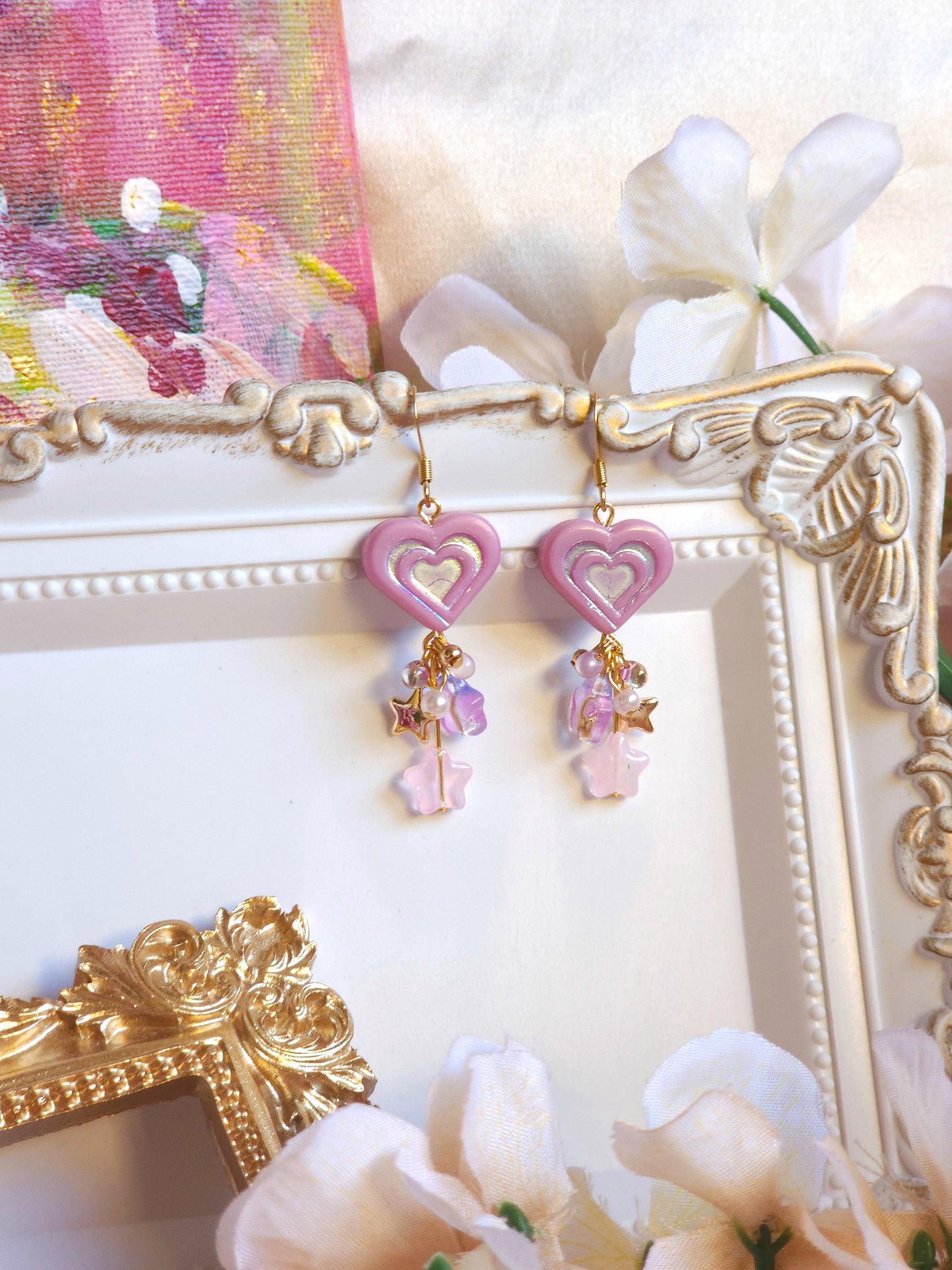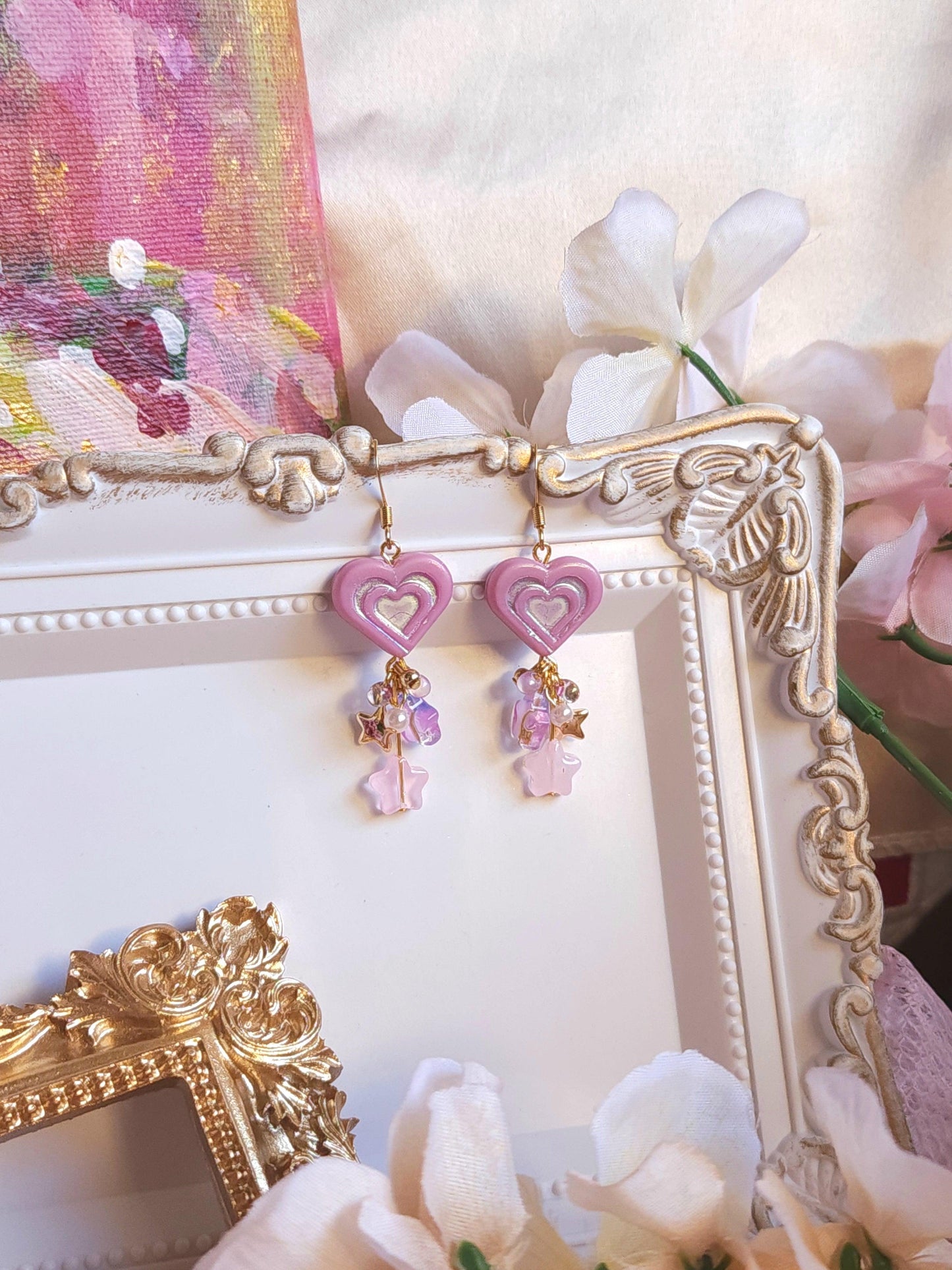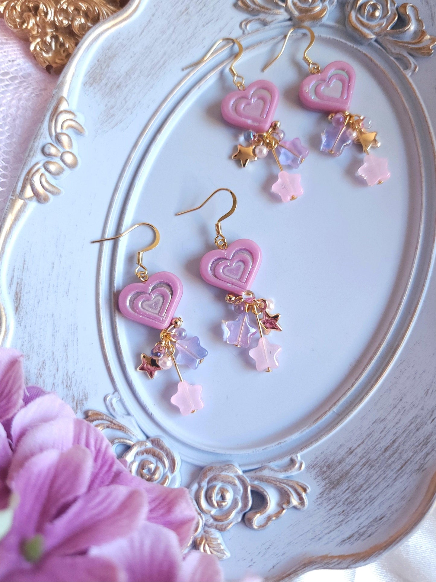 These Superpowered Heart Earrings channels playful charm with its pink heart centerpiece and pink, purple and gold star charms!