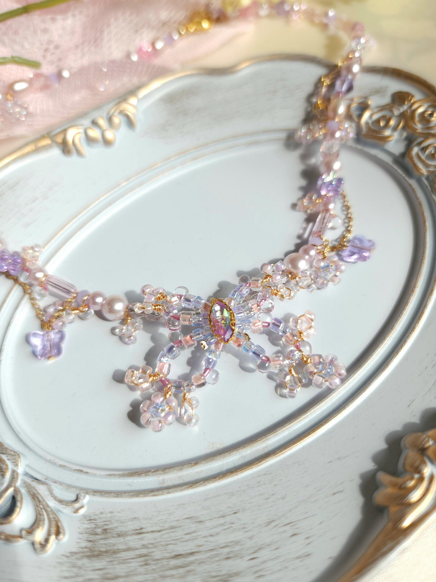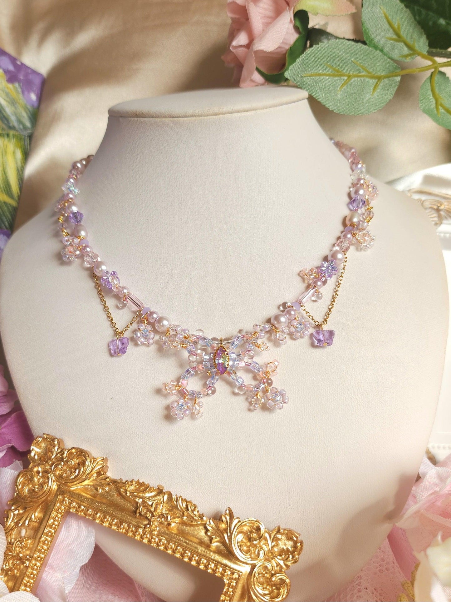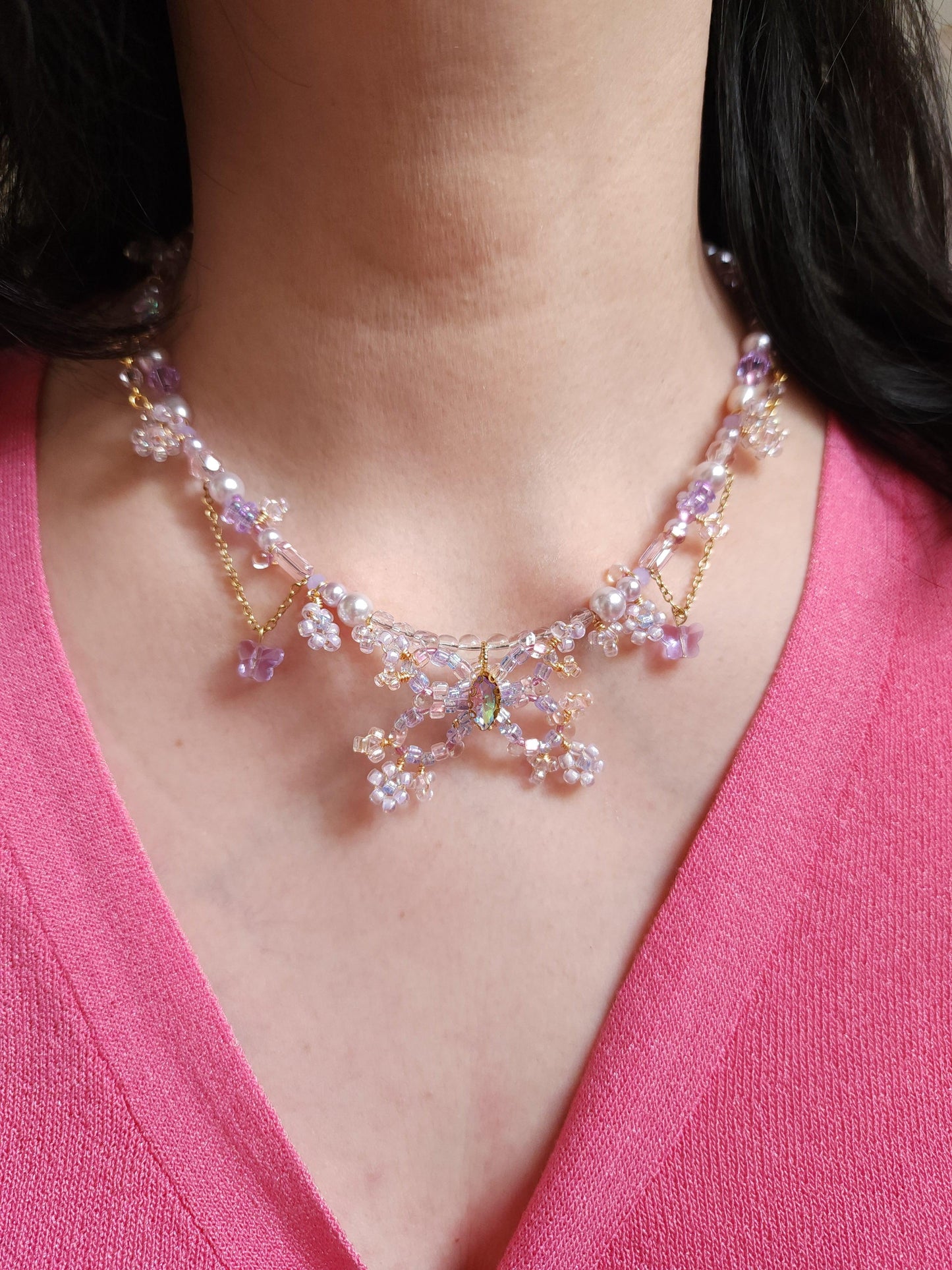 The Butterfly Princess Necklace captures a royal charm with a beaded butterfly centerpiece, highlighted by a mesmerizing iridescent purple crystal at its heart. Adorned with pink and purple pearls and crystals, this necklace exudes a delicate, regal elegance.