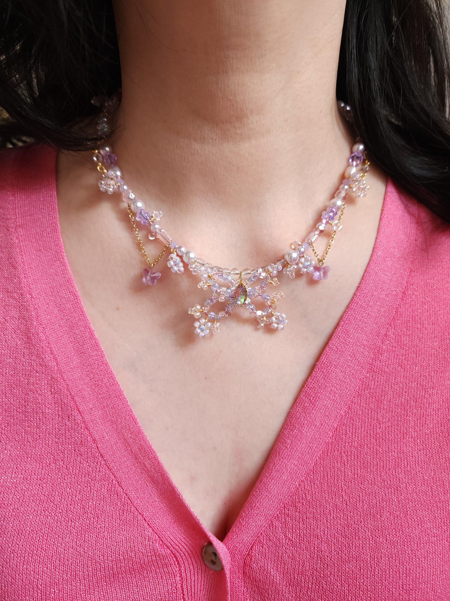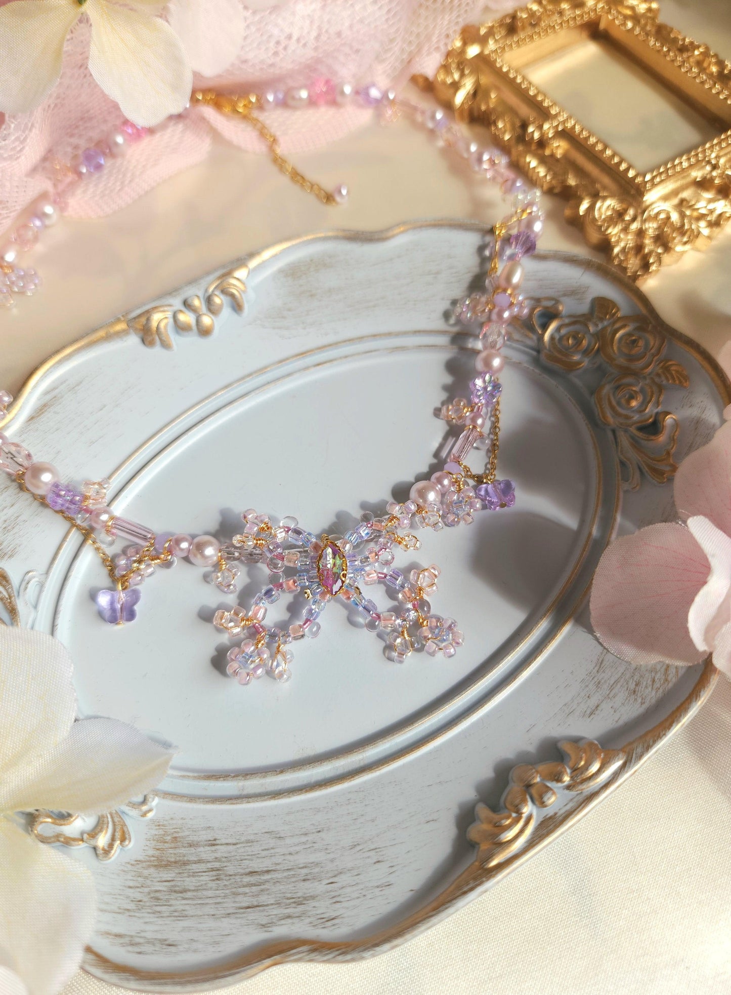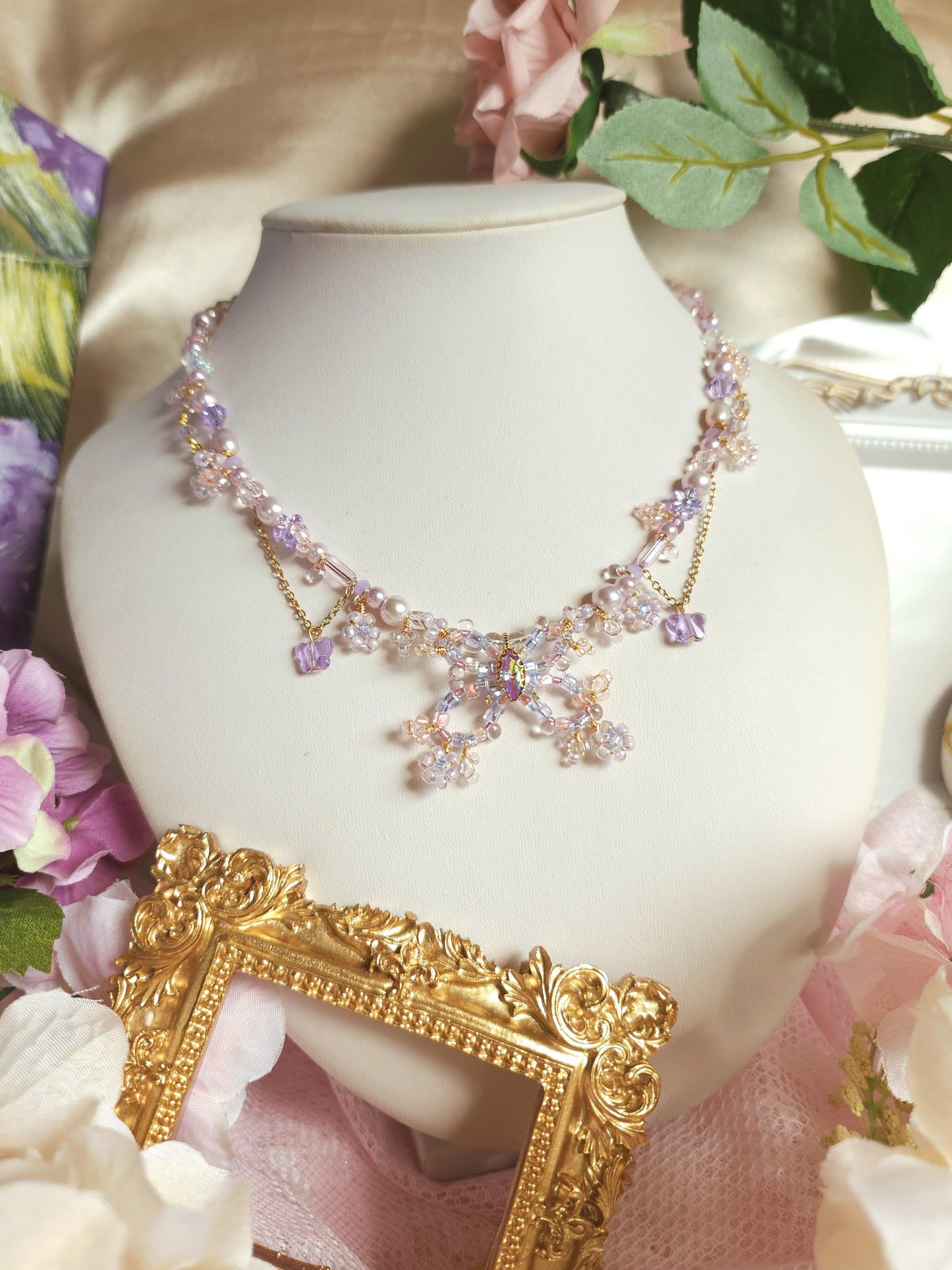 The Butterfly Princess Necklace captures a royal charm with a beaded butterfly centerpiece, highlighted by a mesmerizing iridescent purple crystal at its heart. Adorned with pink and purple pearls and crystals, this necklace exudes a delicate, regal elegance.