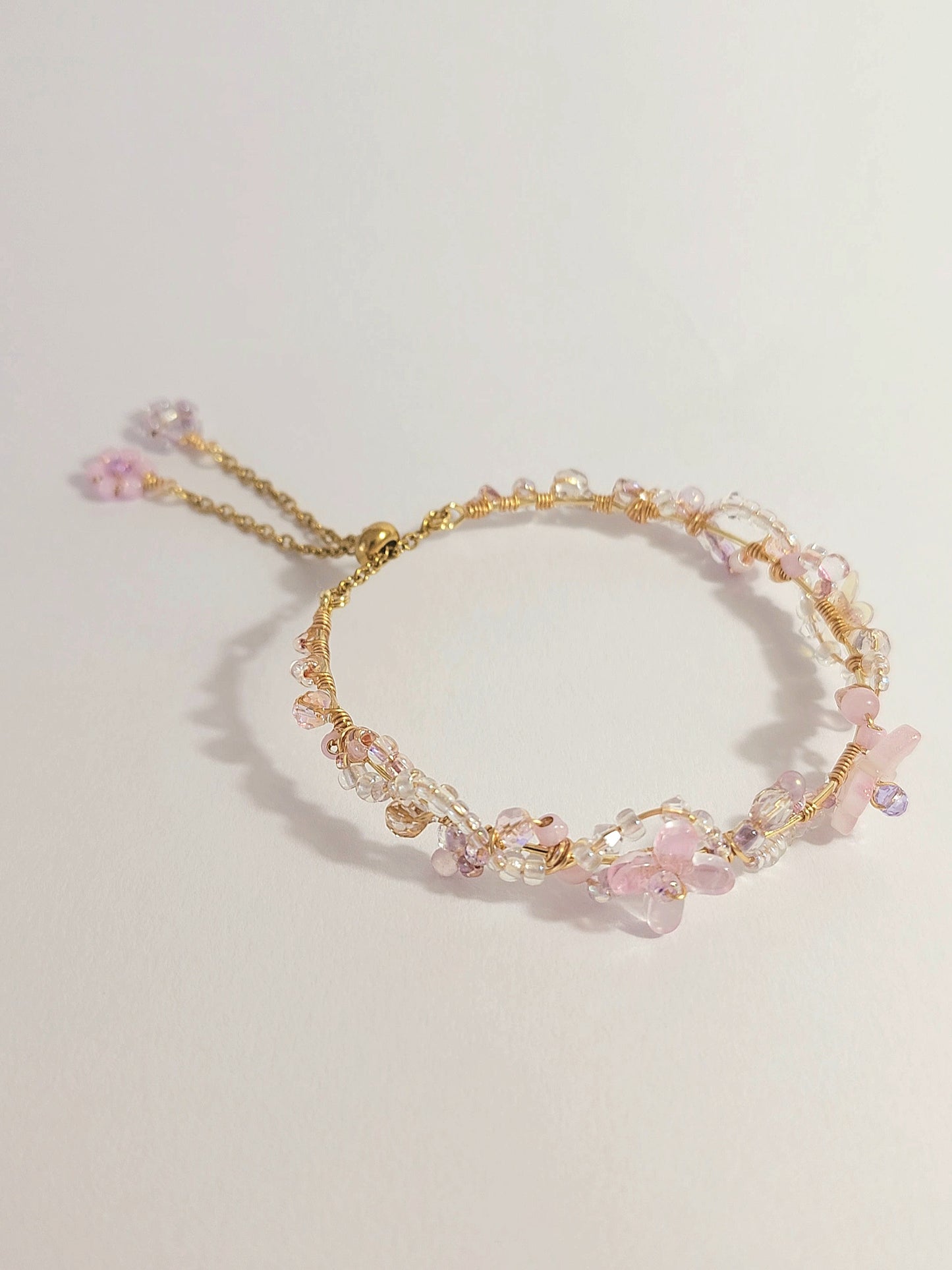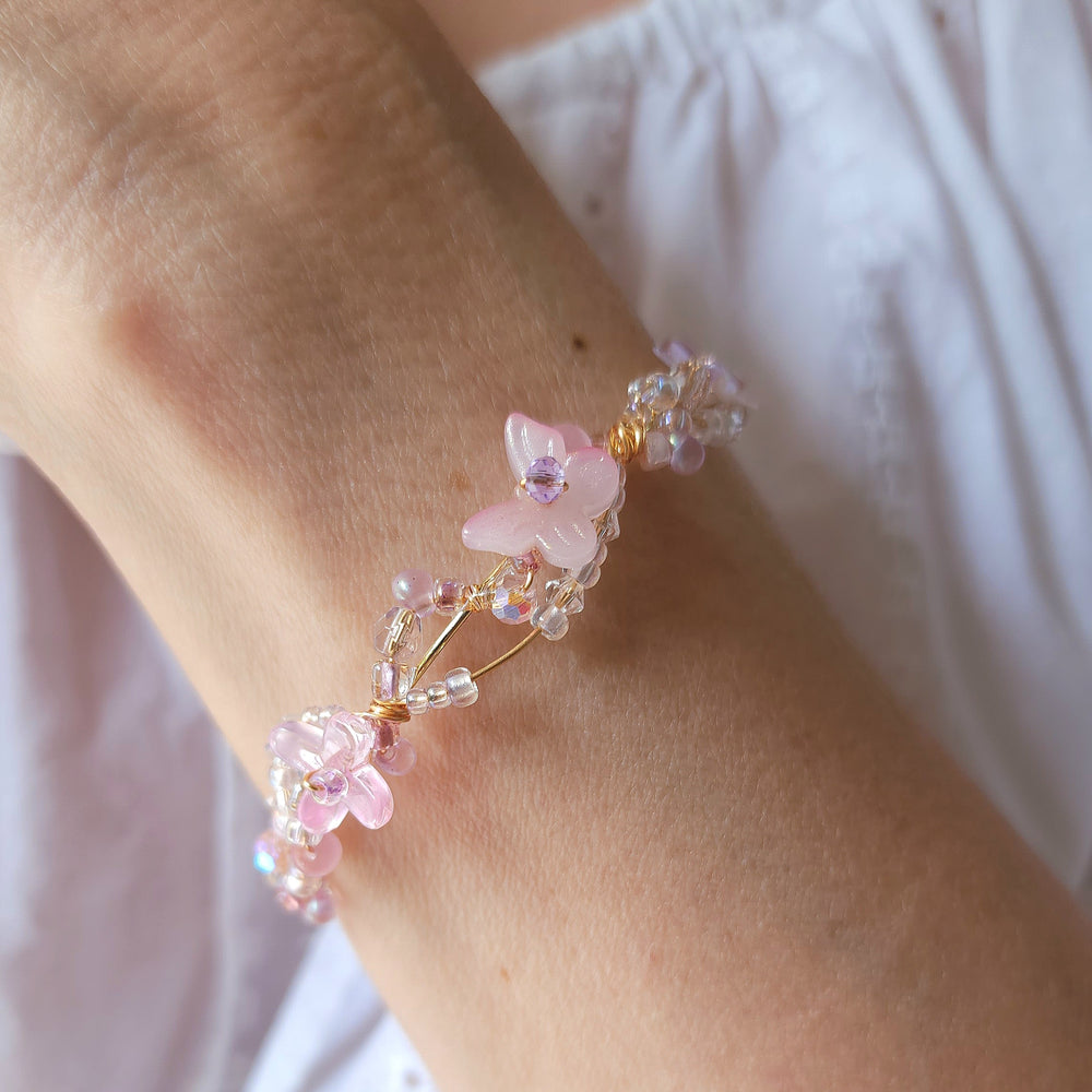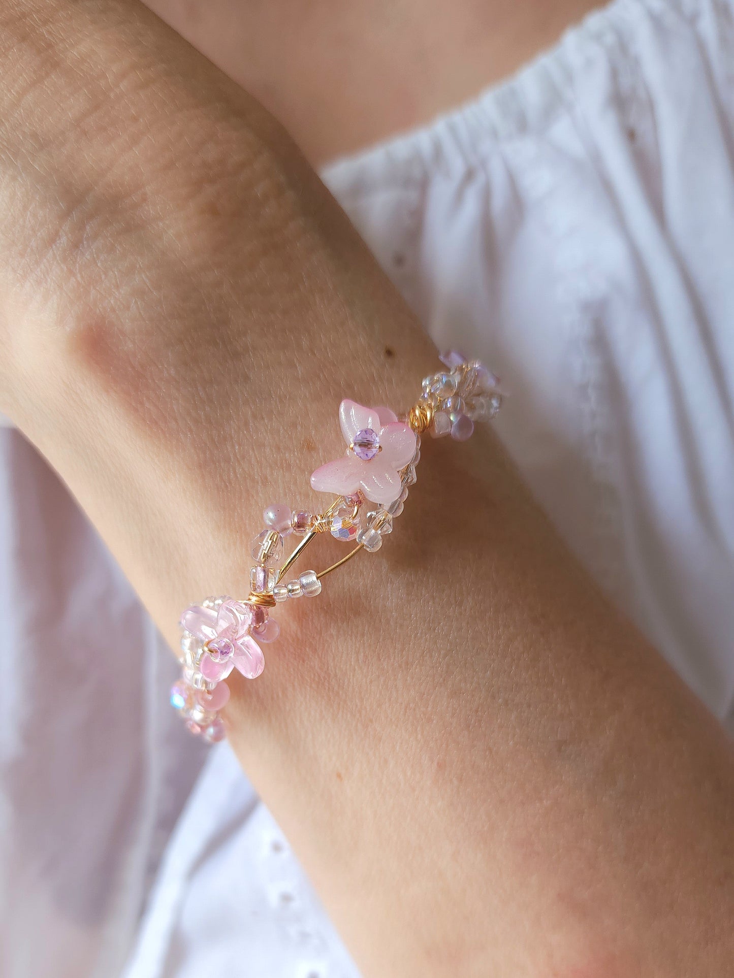 This bracelet dances with every movement, featuring glimmering pastel beads and a dainty butterfly charm. The free-moving beaded sections create a gentle rhythm, evoking the soft beat of butterfly wings.