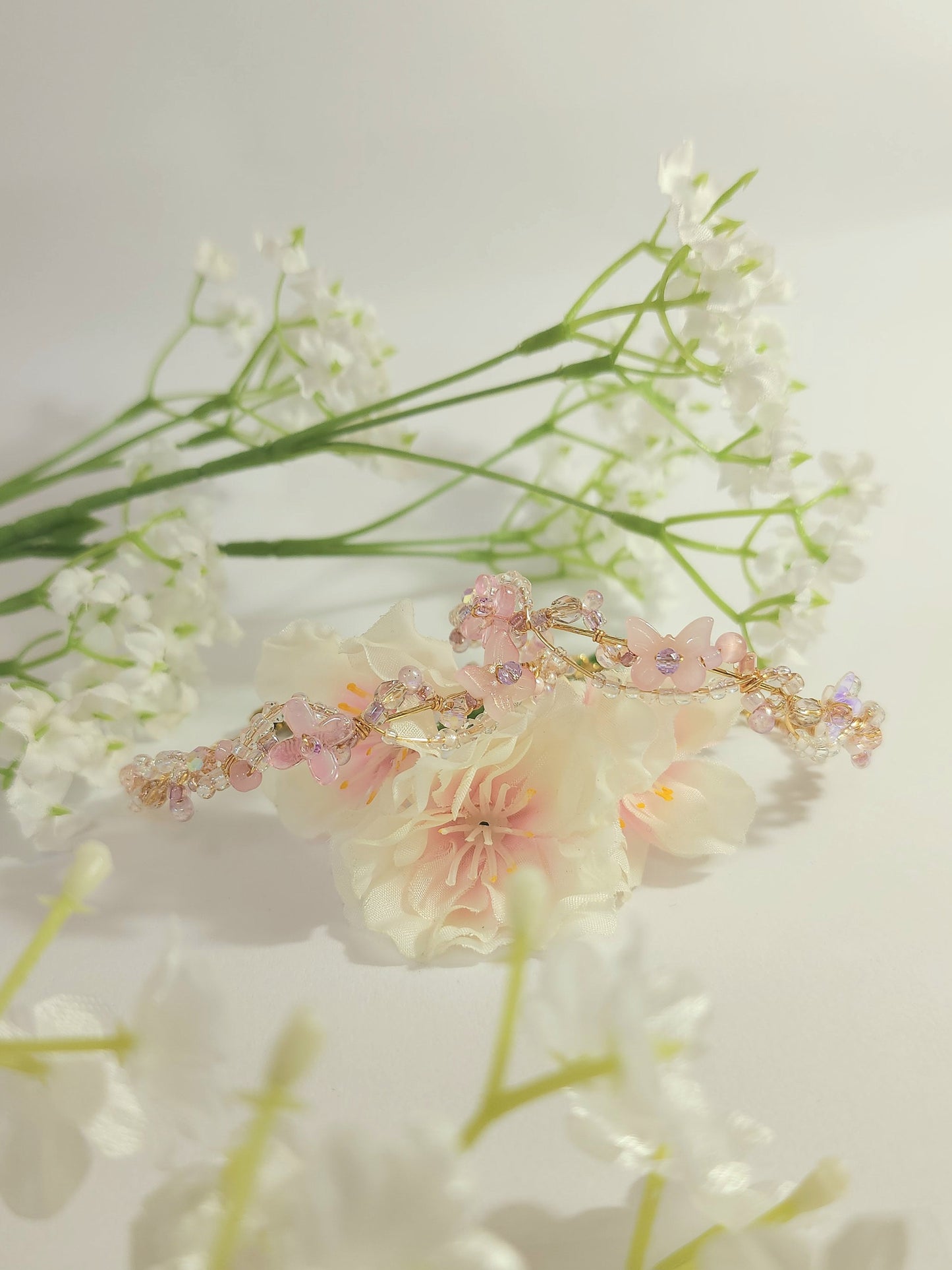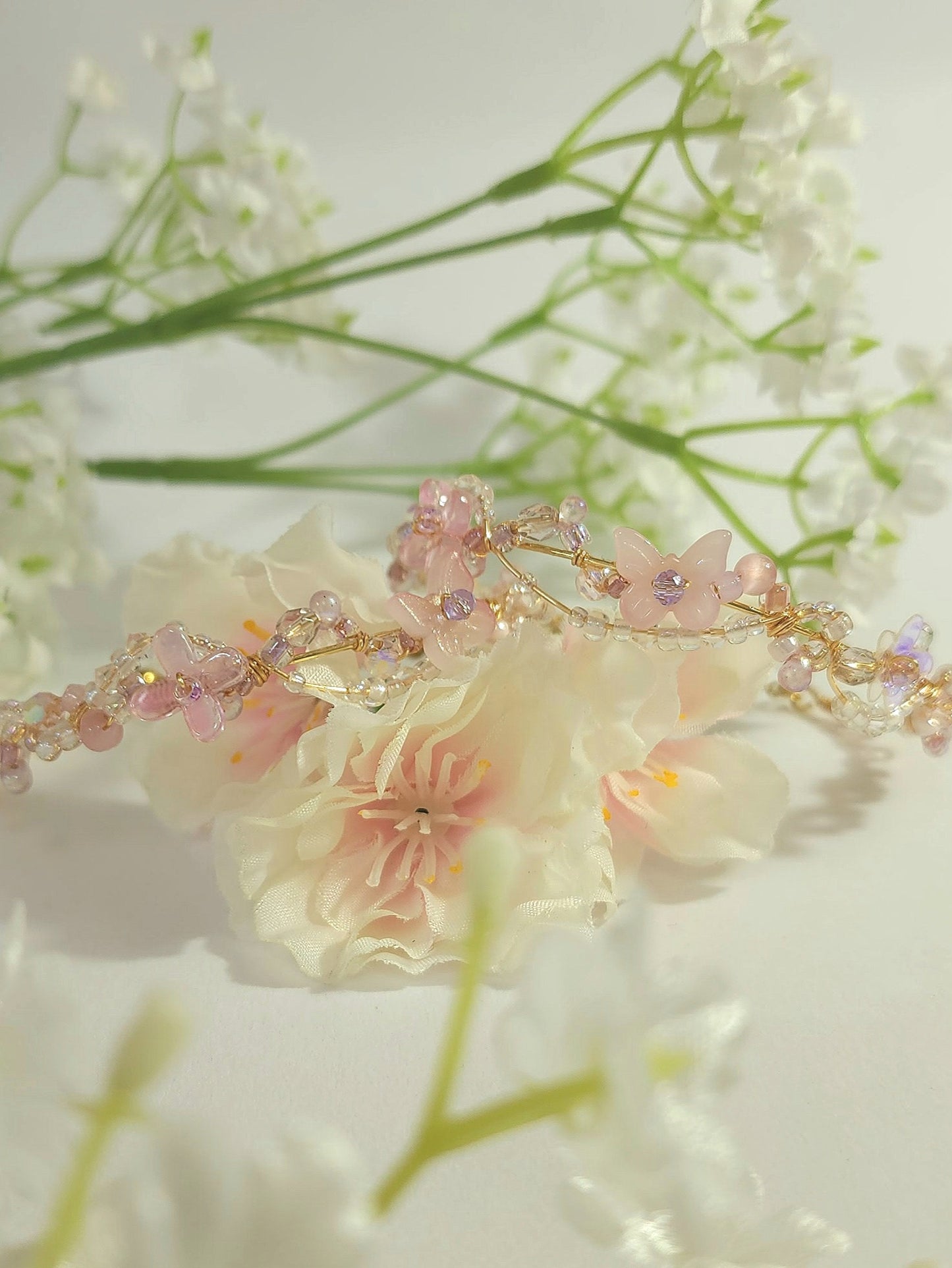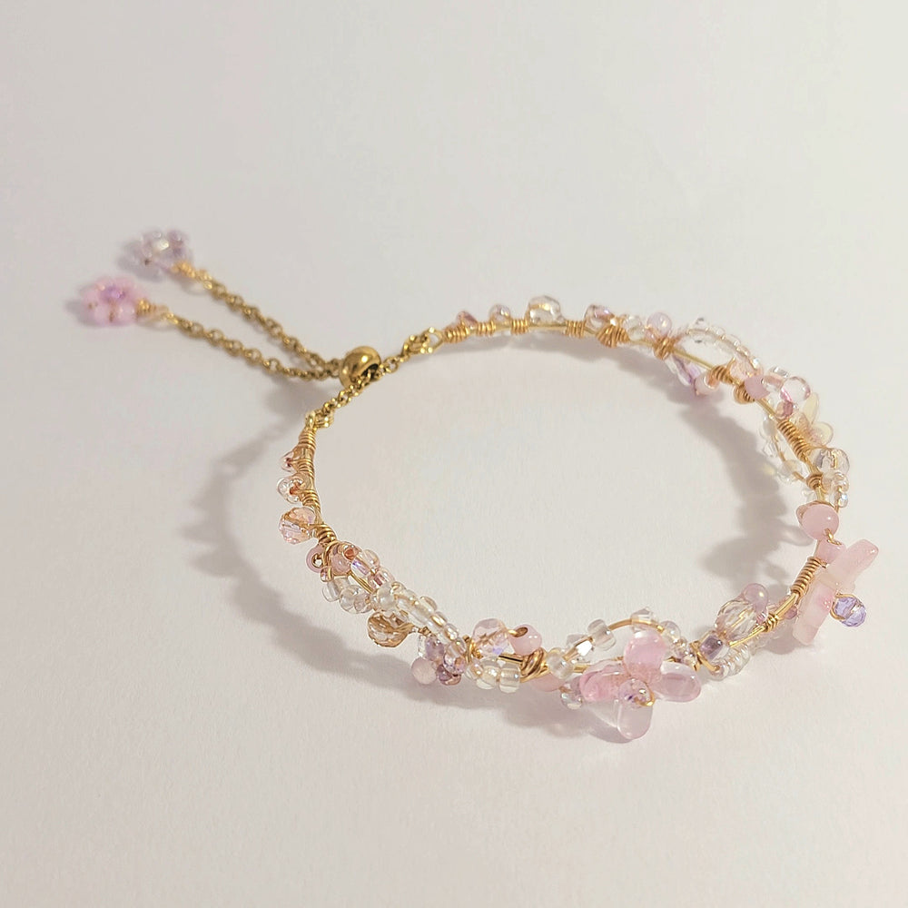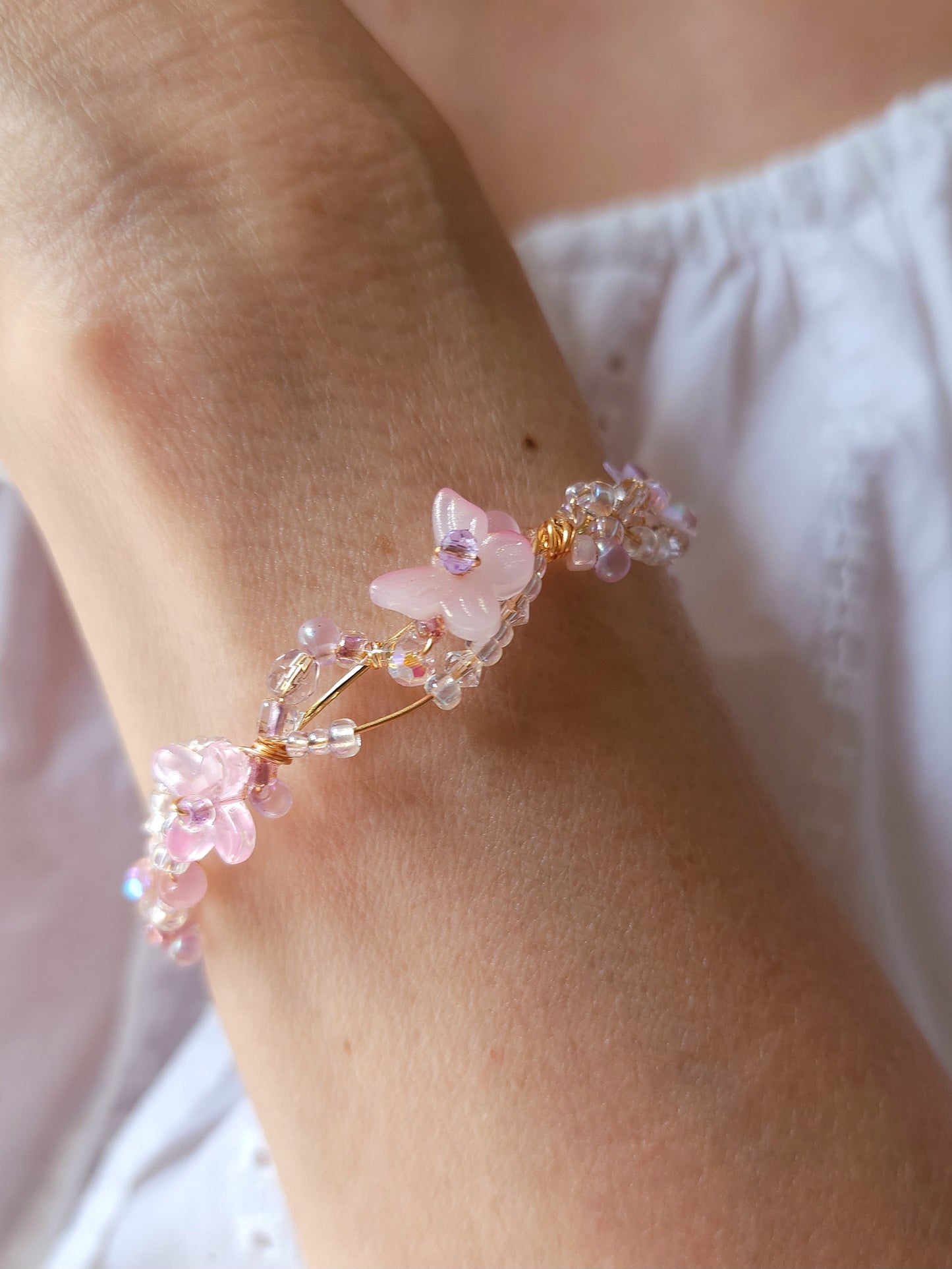 This bracelet dances with every movement, featuring glimmering pastel beads and a dainty butterfly charm. The free-moving beaded sections create a gentle rhythm, evoking the soft beat of butterfly wings.