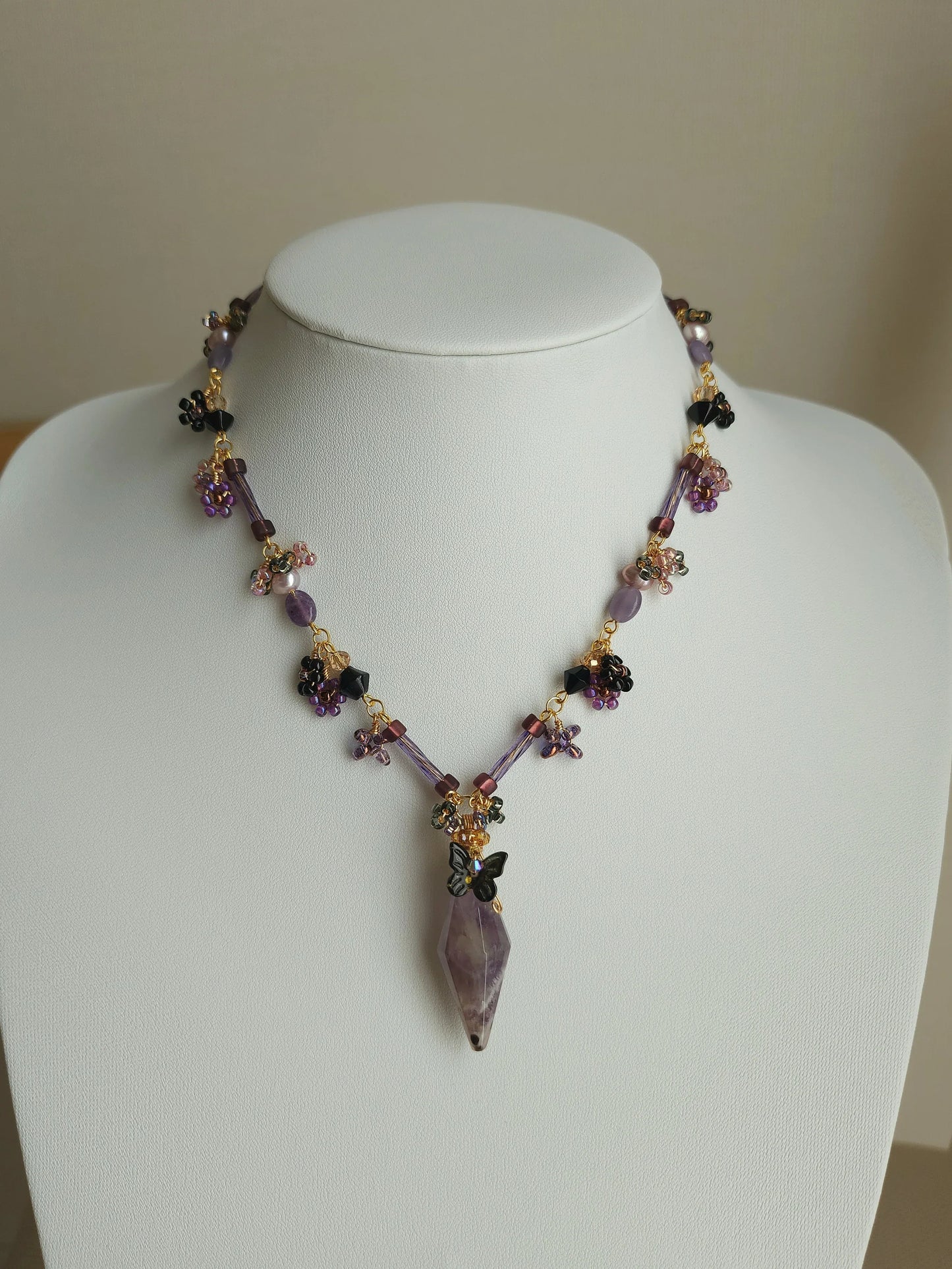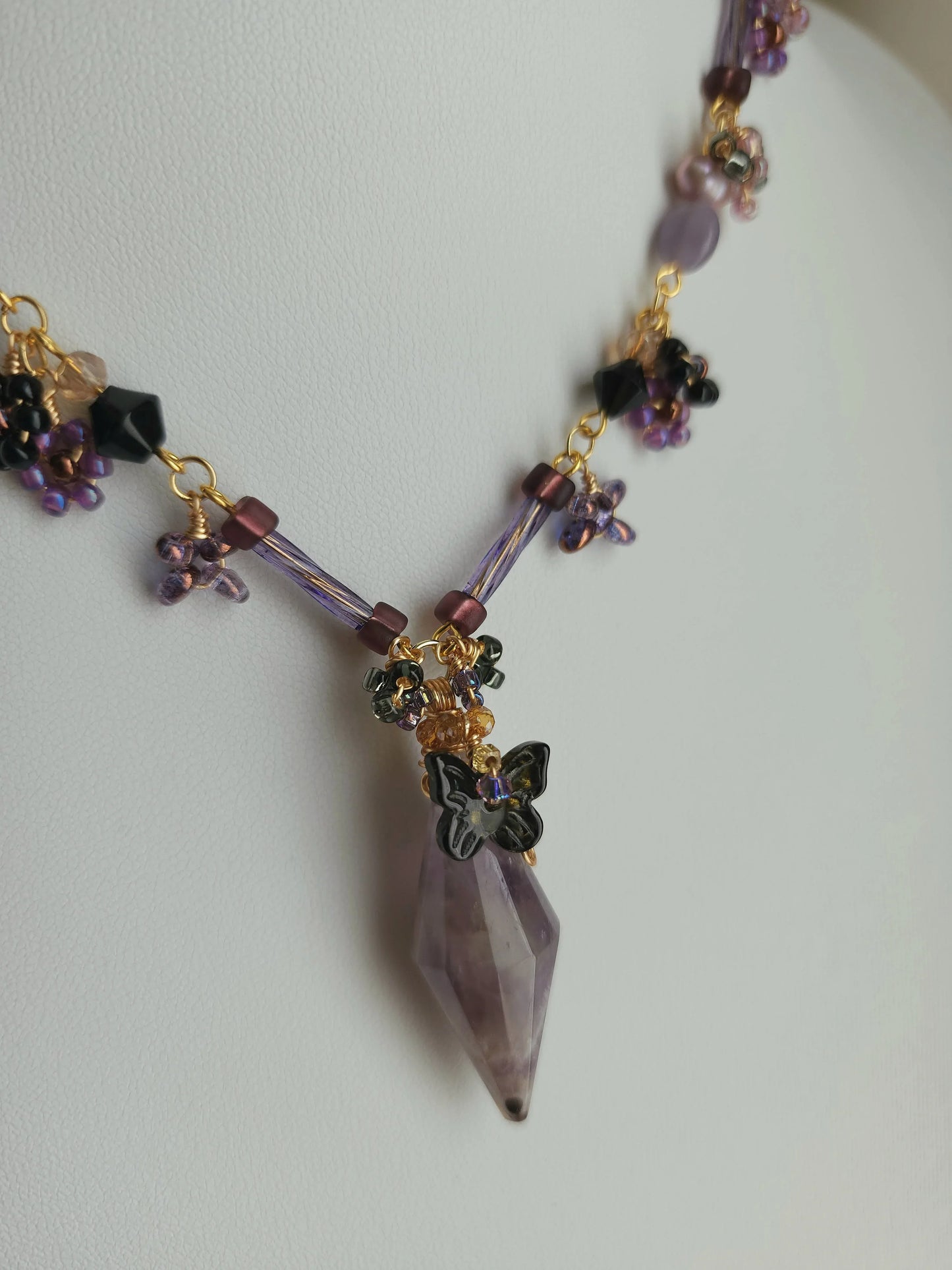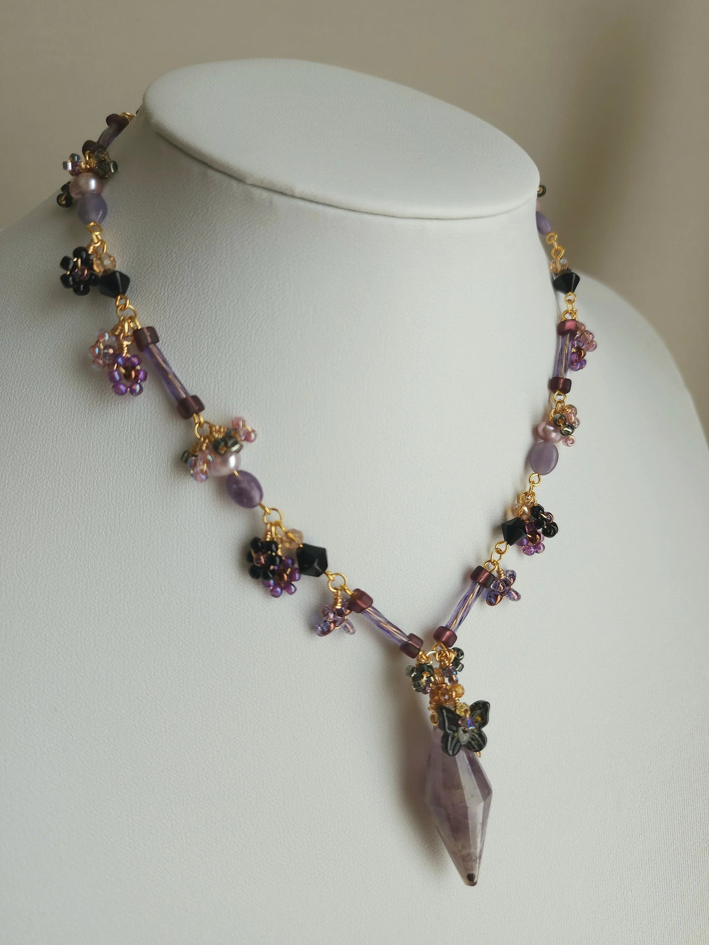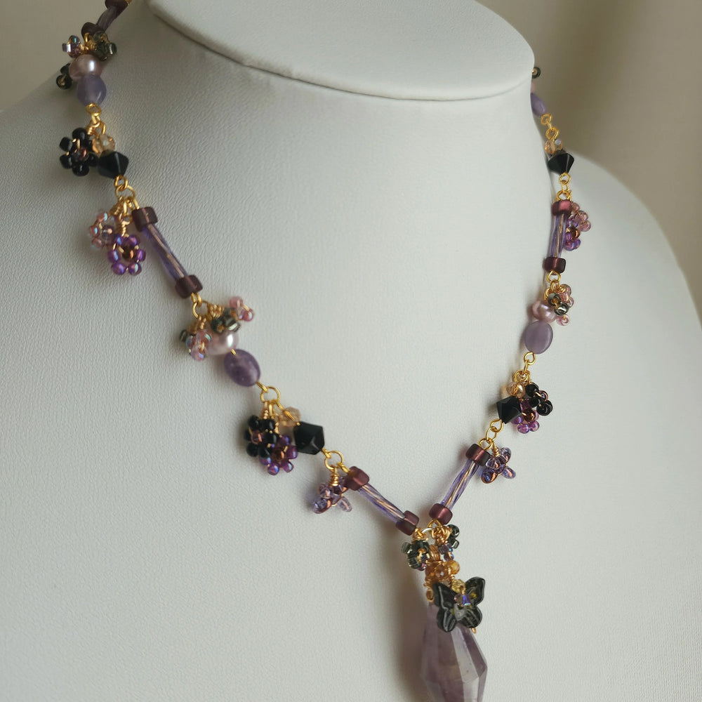 - Handcrafted with amethyst, freshwater pearls, glass beads, and gold-plated findings. The pendant is amethyst, with a wire-wrapped design.