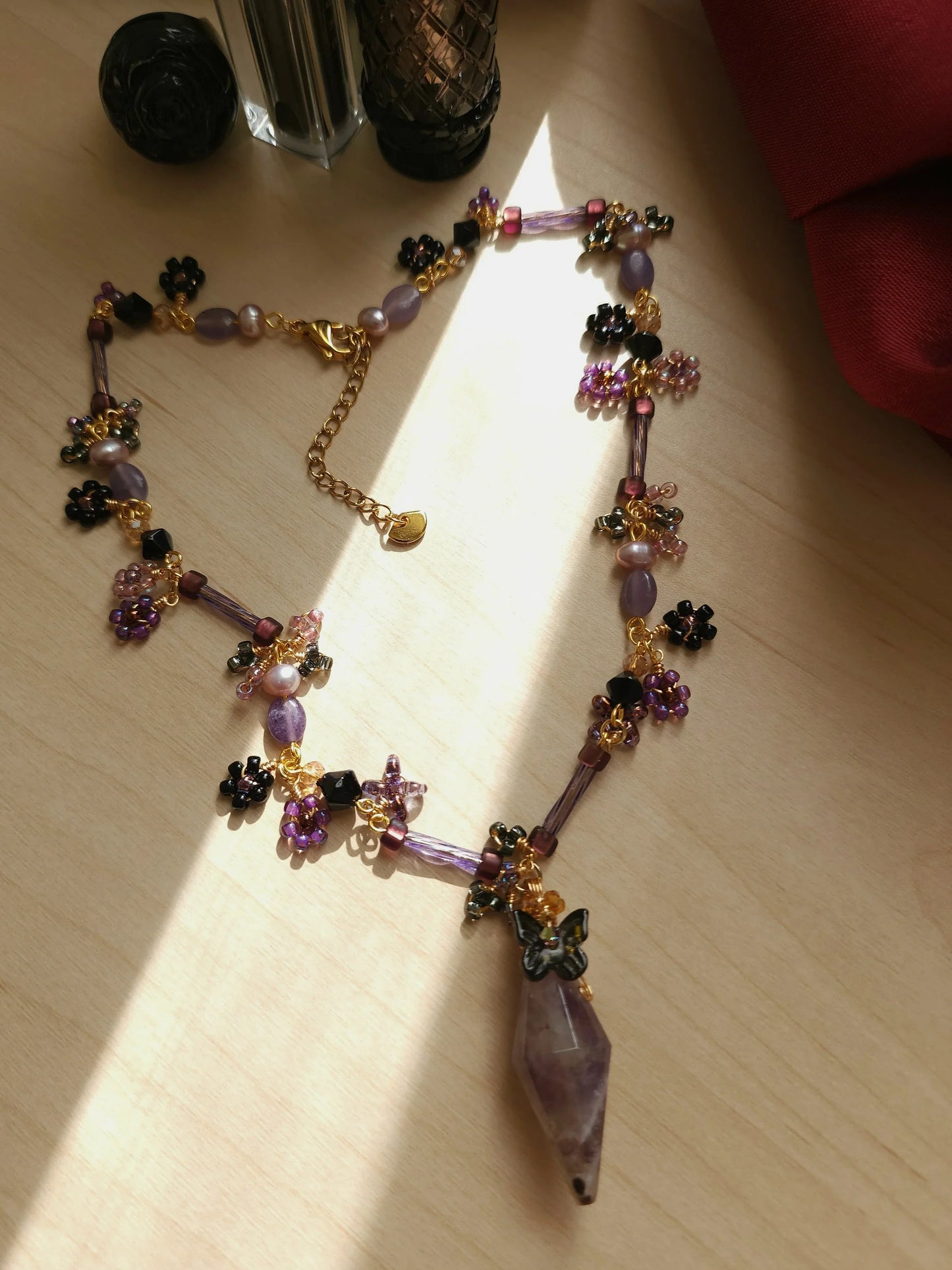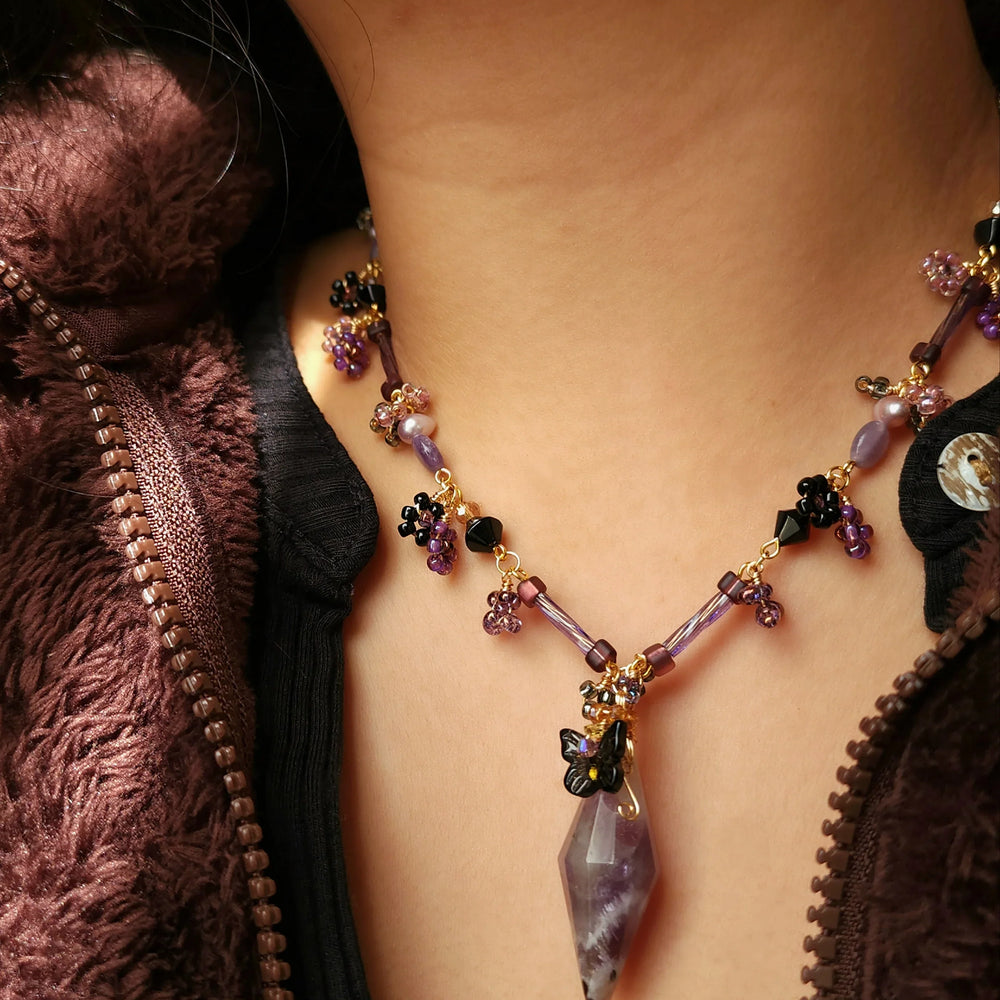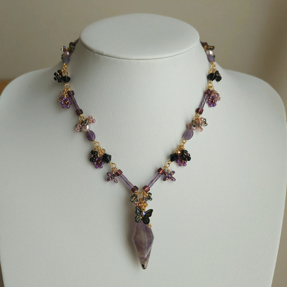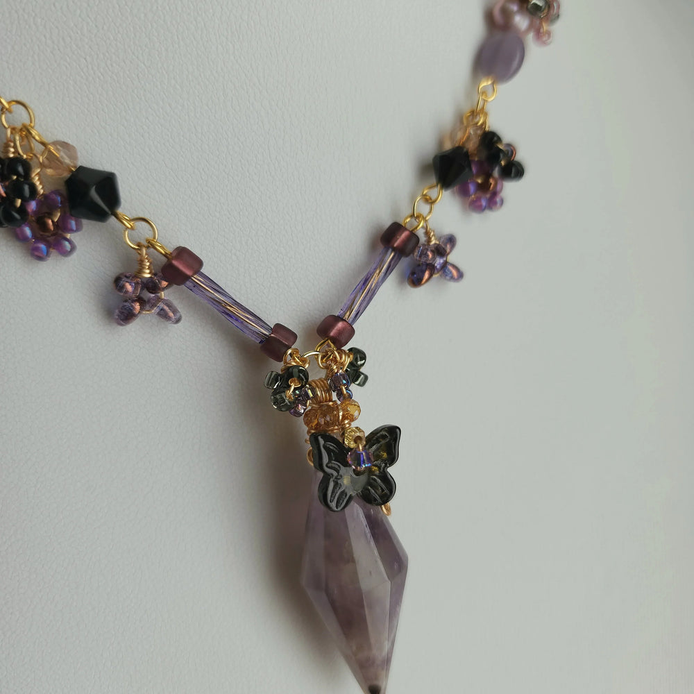 - Handcrafted with amethyst, freshwater pearls, glass beads, and gold-plated findings. The pendant is amethyst, with a wire-wrapped design.