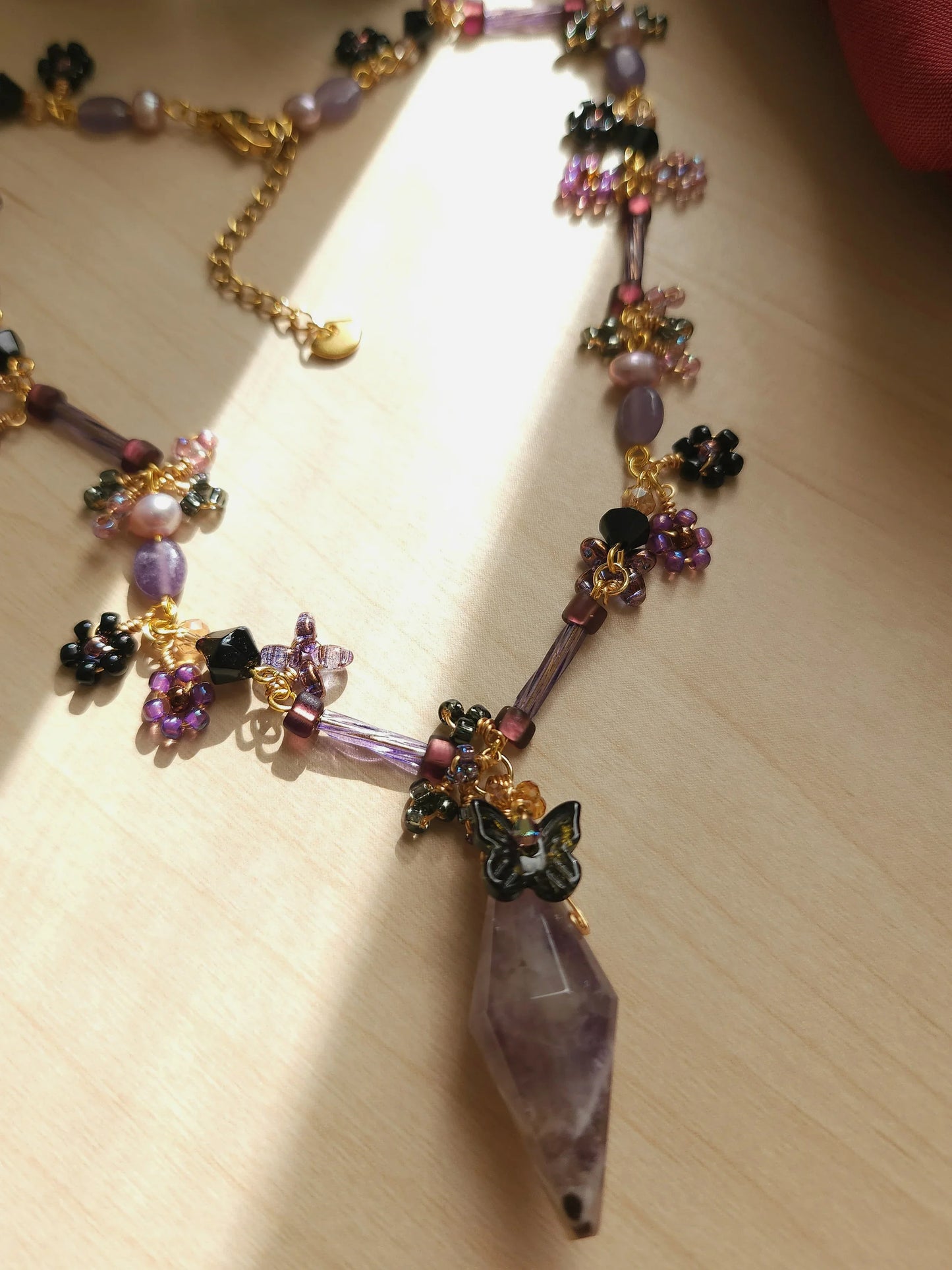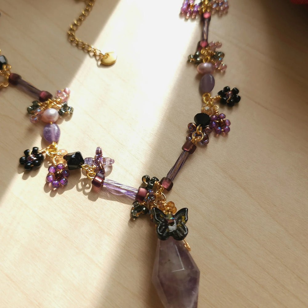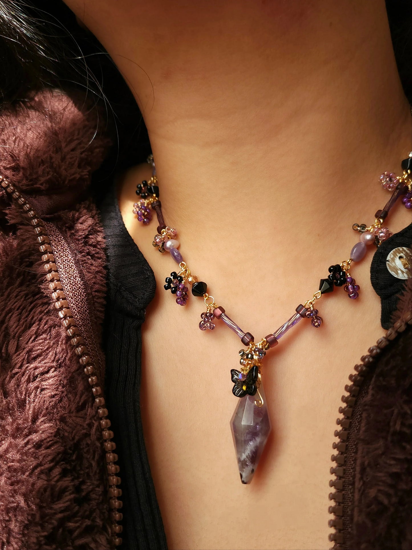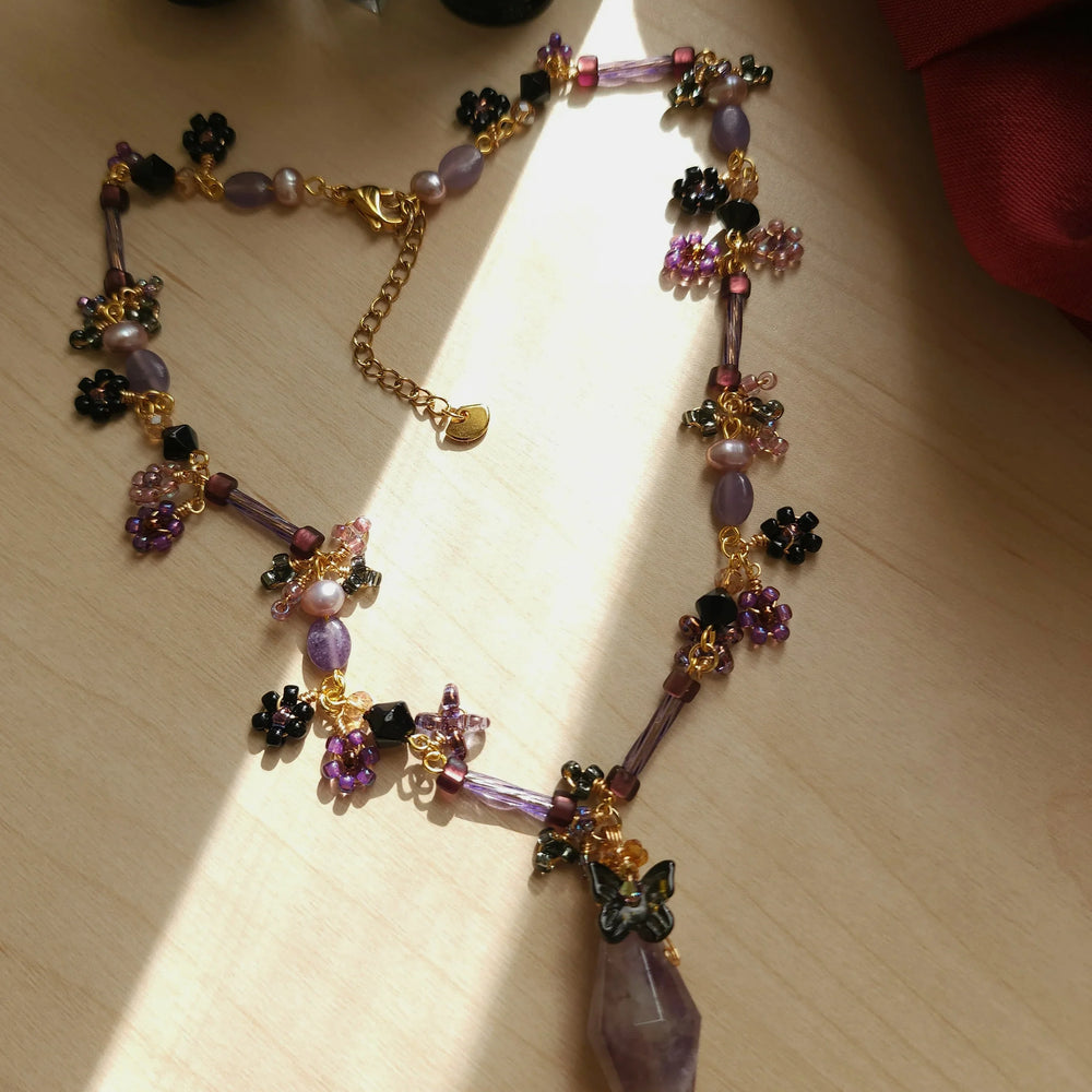 - Handcrafted with amethyst, freshwater pearls, glass beads, and gold-plated findings. The pendant is amethyst, with a wire-wrapped design.